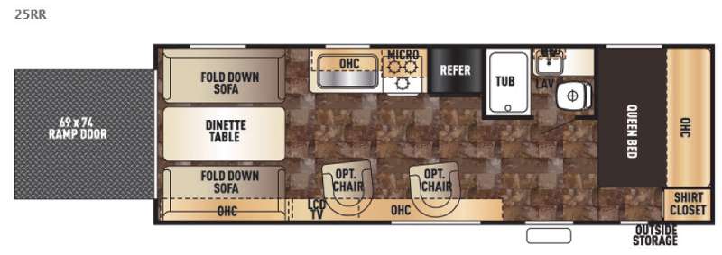 In the rear, you will find a 69" x 74" ramp door and two fold down sofas with a dinette table.