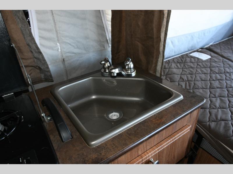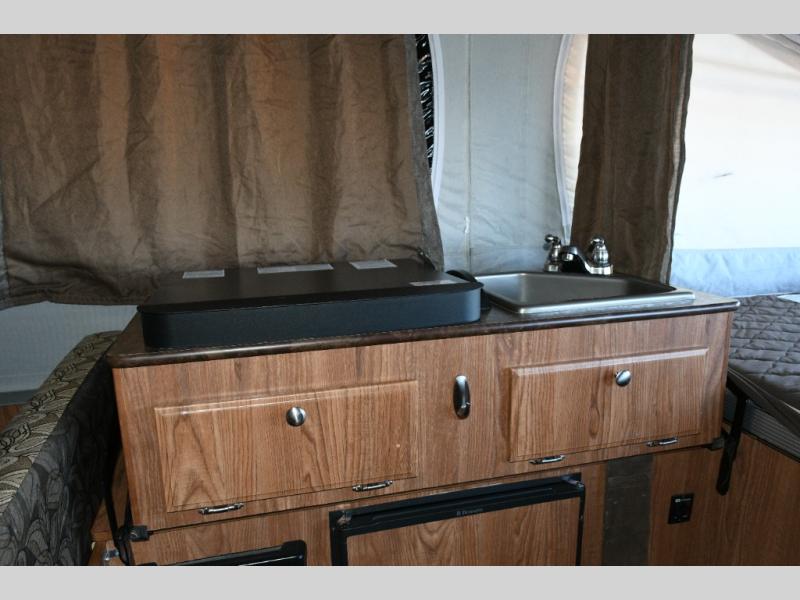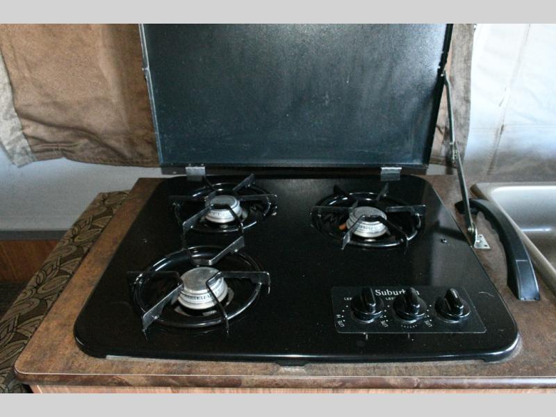 The opposite side of the camper features the main kitchen area, including a three-burner range, sink, and dinette, with an option to add a refrigerator for even more convenience. Whether you’re preparing breakfast before a hike or dinner at the campsite, you’ll have everything you need close at hand.