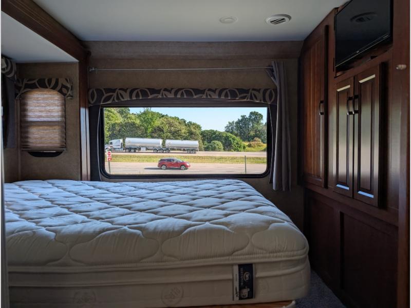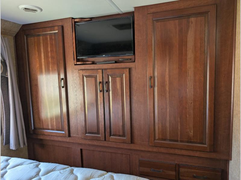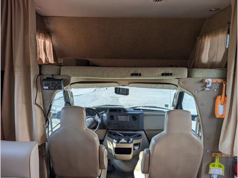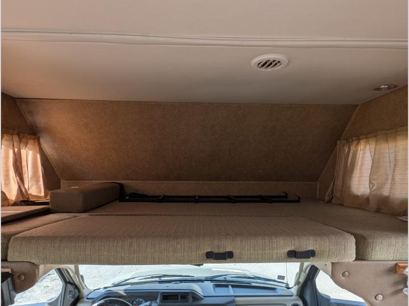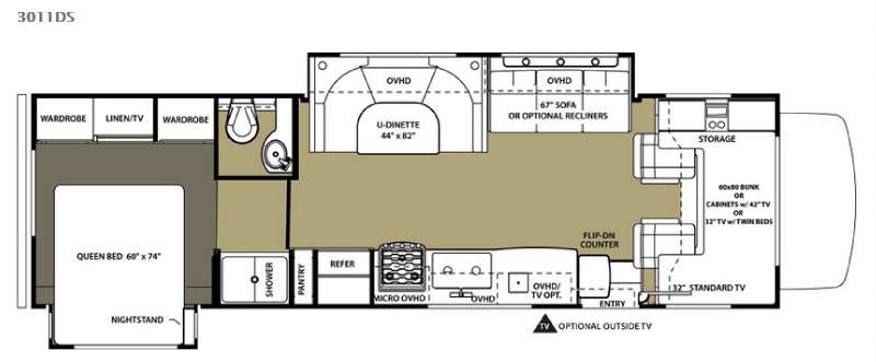 Back at the front, the area over the cab comes standard with storage and a 60" x 80" bunk, or you may choose optional cabinets with 42" TV or 32" TV with twin beds.
