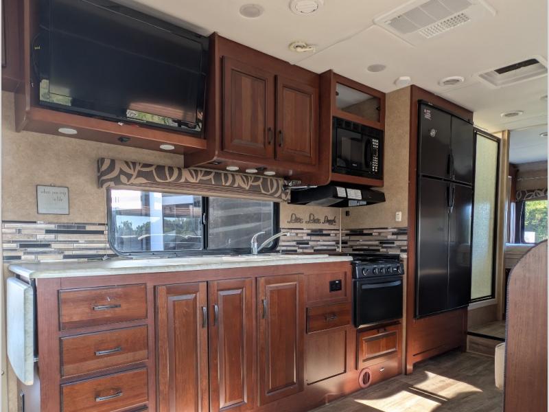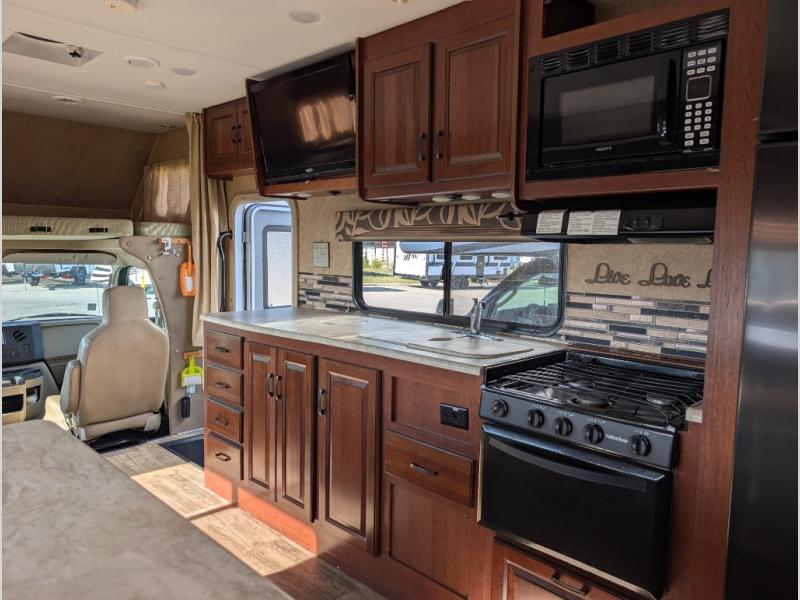 As you enter this class C motor home, to your left is the kitchen. It features a counter space with a flip down counter extension, overhead cabinets, double kitchen sink, three burner stove with overhead microwave, refrigerator and pantry.