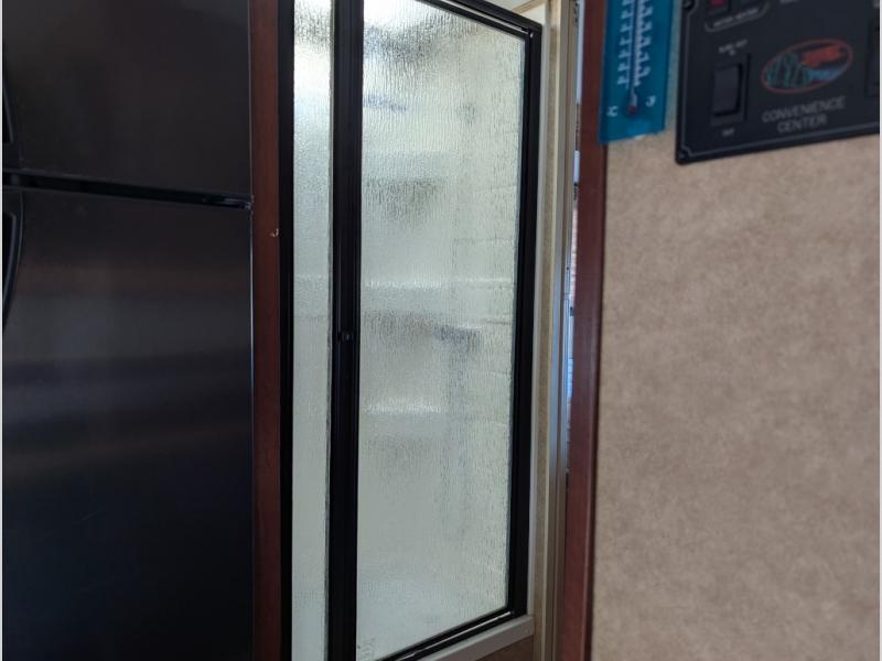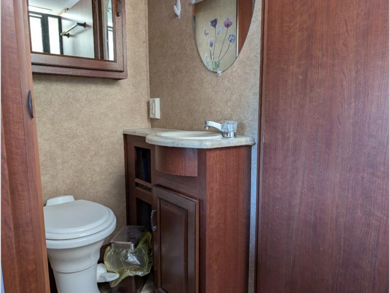 As you continue toward the back of the motor home, there is a split bathroom with a shower on one side and a private toilet area with overhead cabinets, a sink with extended vanity and medicine cabinet. The rear of the Forester 3011DS offer a private bedroom. The queen size bed is within a slide and includes one nightstand. Across from the bed, the wall contains double wardrobes with linen storage and space for an optional TV between them.