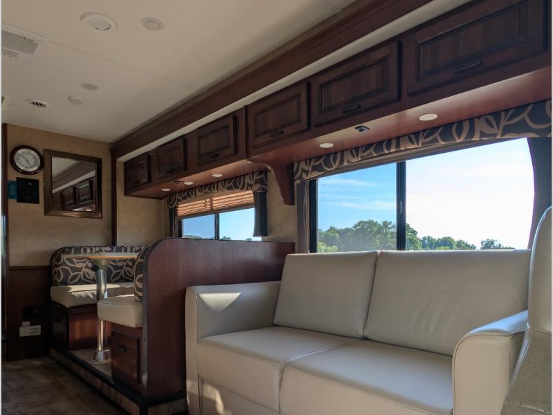 Opposite the kitchen, a slide out has a spacious u-shaped dinette, or you can choose an optional dream dinette, and a 67" sofa, with overhead cabinet storage running the width of the slide.