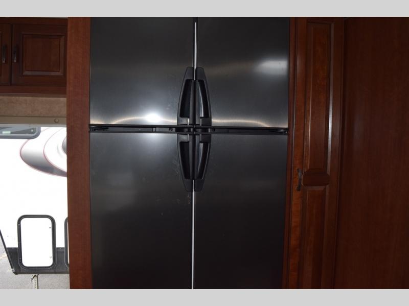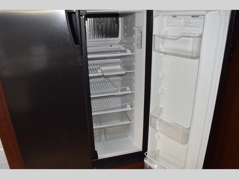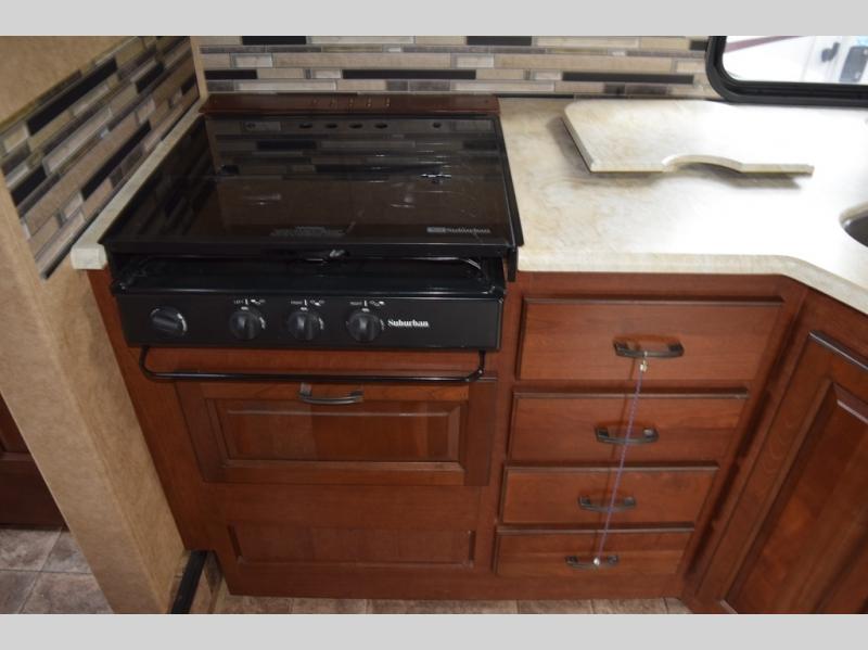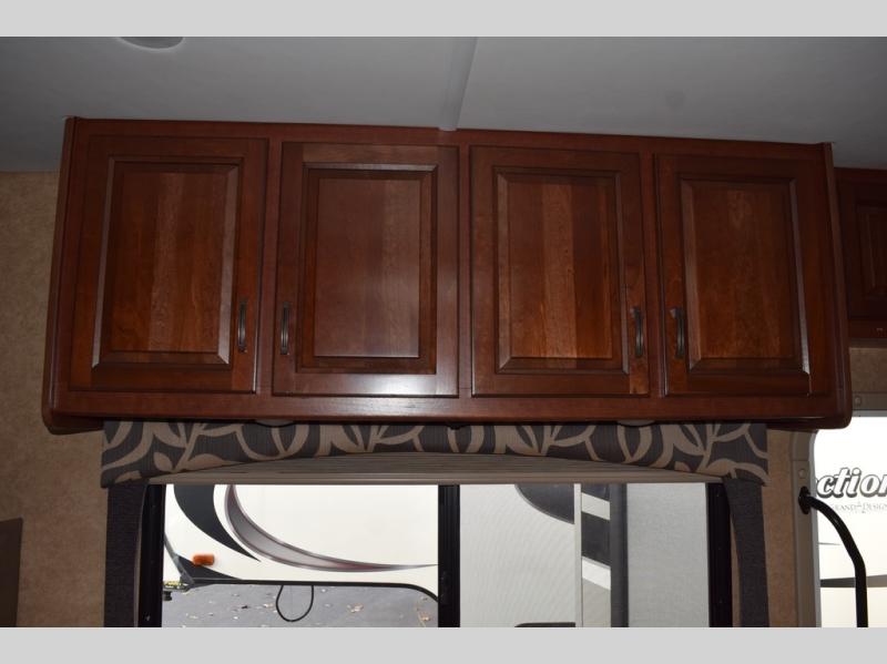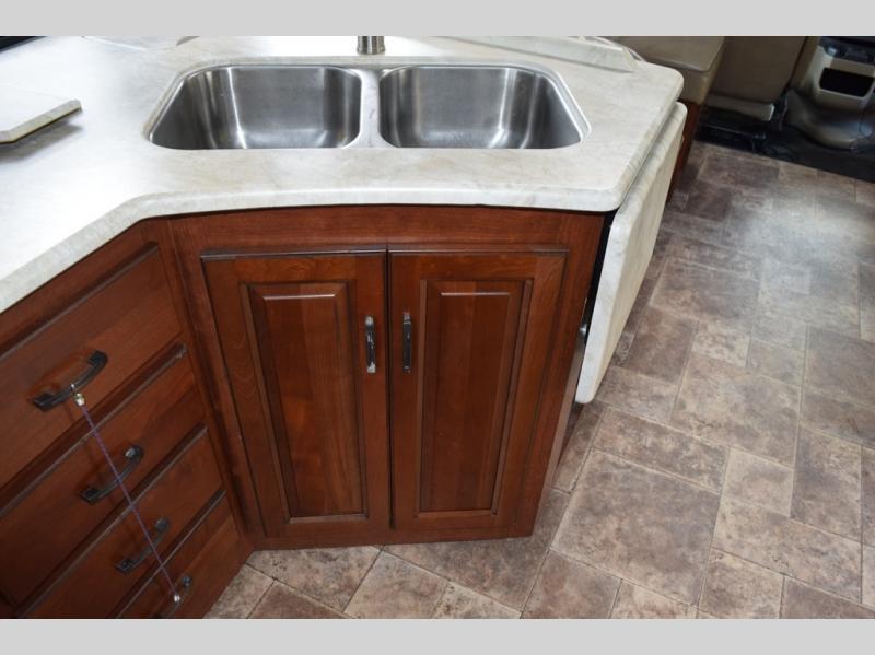 The living and kitchen areas feature a sofa with overhead cabinets, a two door refrigerator or you can choose an optional four door refrigerator, and a pantry along one wall. The opposite side boasts an L-shaped kitchen countertop with three burner range, overhead microwave and cabinets, countertop trash access behind the corner angled double kitchen sink and a flip down countertop extension. There is also a dinette with overhead cabinets.