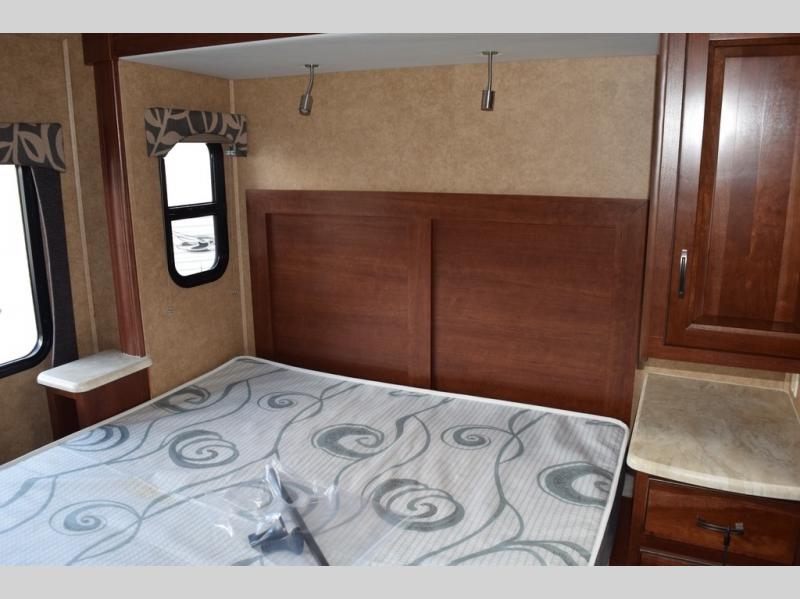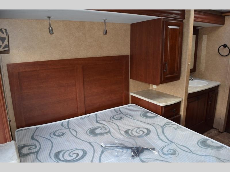 The rear features a queen bed with nightstands on both sides as well as a shirt closet on one side. Across from the bed, you will find two wardrobes with linen storage between them and space for an optional TV. The split bathroom is part of this private bedroom. It features a private area with a toilet and tub/shower combination on one side, with a hamper and large vanity sink on the other.