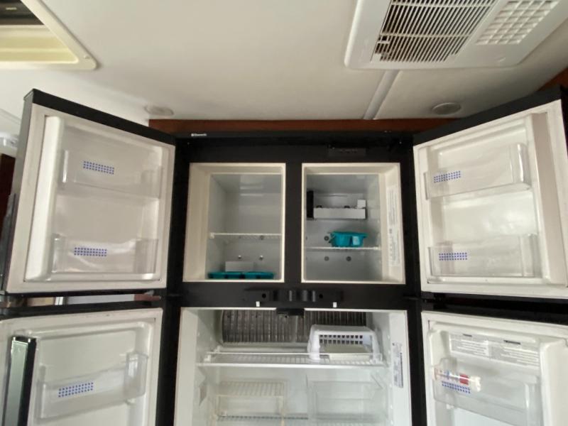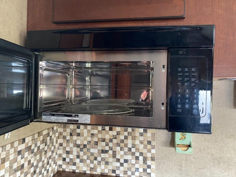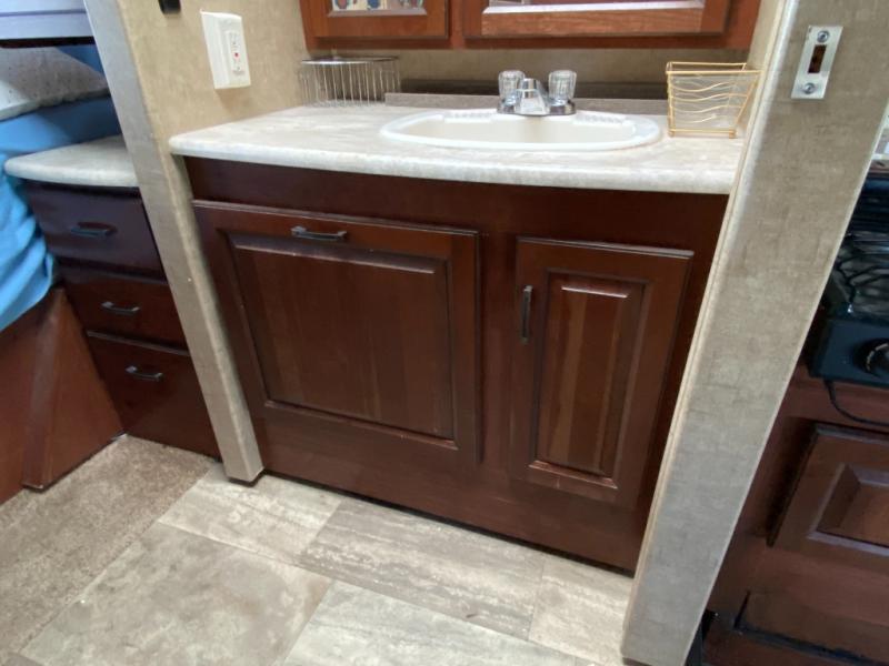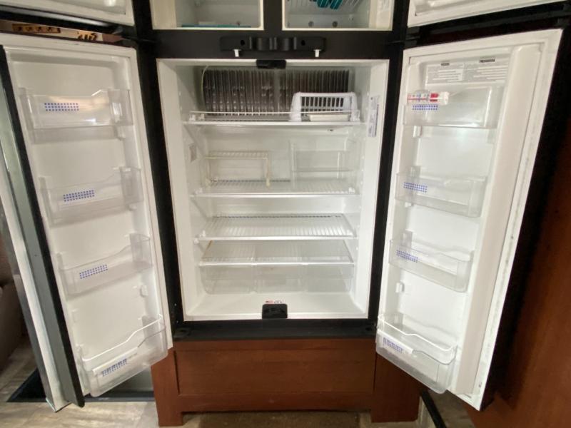 The living and kitchen areas feature a sofa with overhead cabinets, a two door refrigerator or you can choose an optional four door refrigerator, and a pantry along one wall. The opposite side boasts an L-shaped kitchen countertop with three burner range, overhead microwave and cabinets, countertop trash access behind the corner angled double kitchen sink and a flip down countertop extension. There is also a dinette with overhead cabinets.
