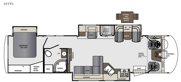 When you step inside the Georgetown XL 377TS motor home by Forest River you will immediately notice the openness of this floor plan. As you enter on the left, there is a three burner range, double kitchen sink, and l-sofa slide. Adjacent to the sofa there is a TV and fireplace. The opposite side of the motor home has a dinette, refrigerator, lounge chair slide. You can choose an optional free-standing table and chairs in place of the dinette.