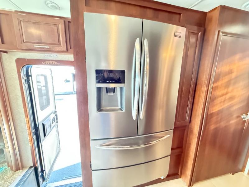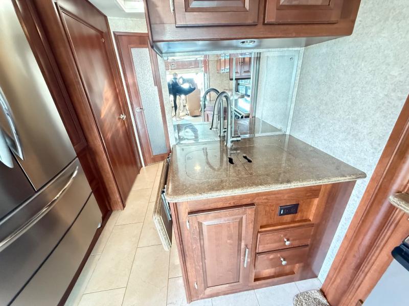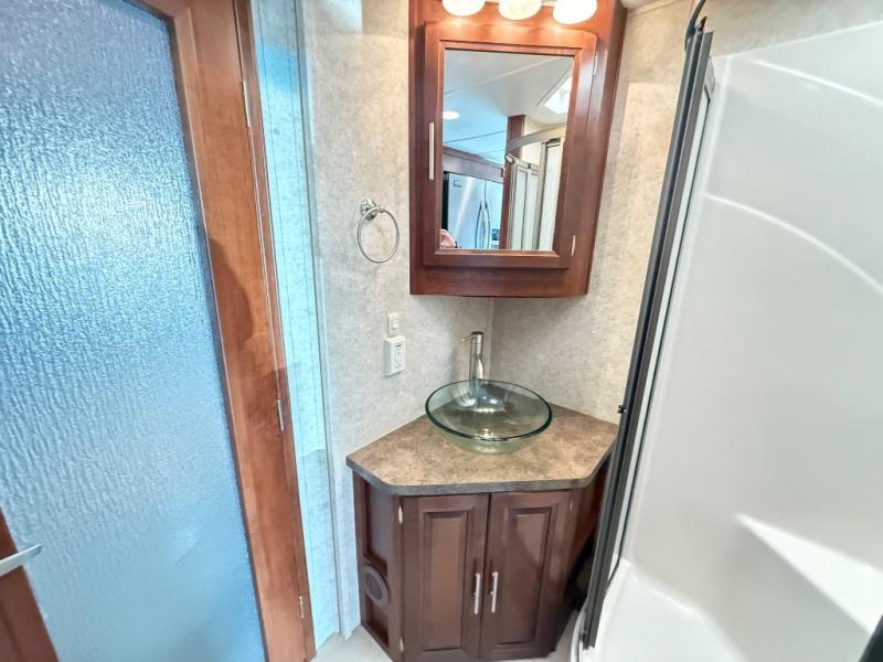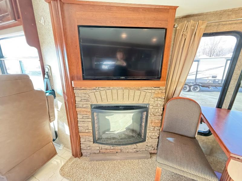 This 378TSF Georgetown XL motor home by Forest River offers so much living space. Stepping inside the model to the right there is a slide with a free-standing dinette, and just past the dinette there is a corner TV and fireplace. The opposite slide has an chair, hide-a-bed sofa or optional L-shaped sofa, three burner range, and microwave slide. Proceeding through the motor home you will find a double kitchen sink, and a refrigerator and pantry.