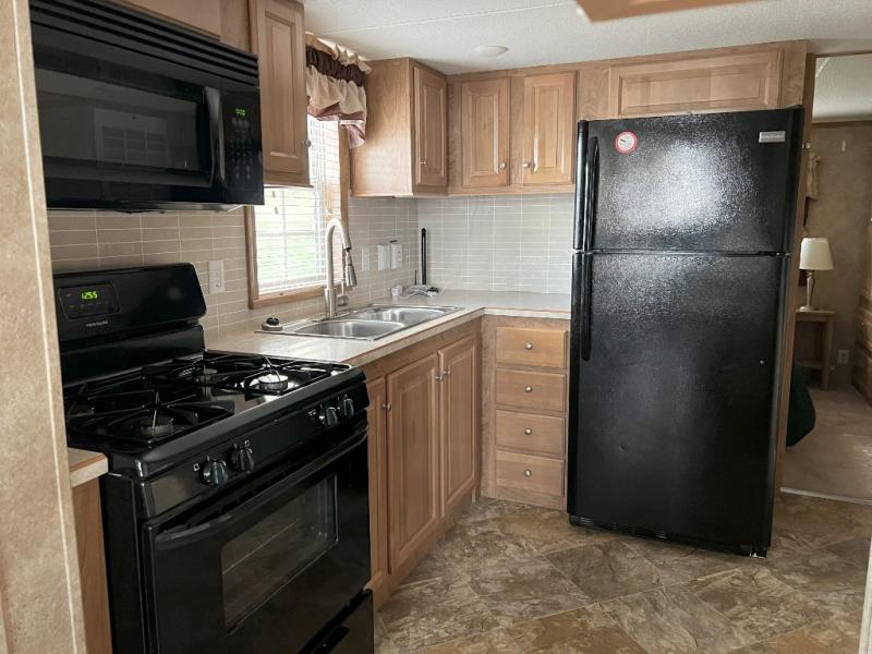 Enjoy meals at the table, and maybe sit a bit longer and enjoy a second cup of coffee, or a card game or two. Just past the table you will find a four burner range, double kitchen sink, l-shaped counter which is great for meal prep, and a refrigerator. There are also overhead cabinets where you can store dishes or canned goods.