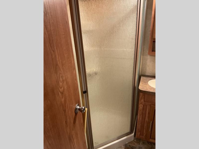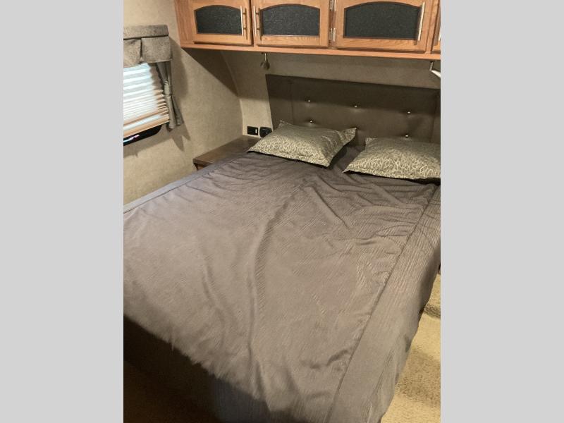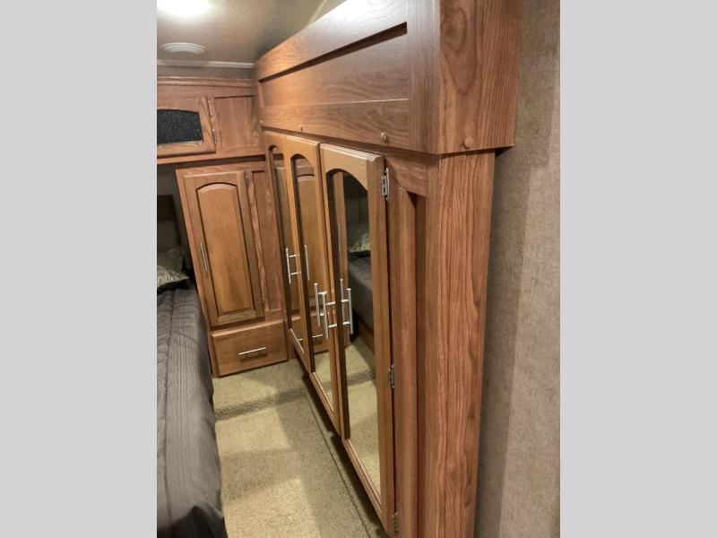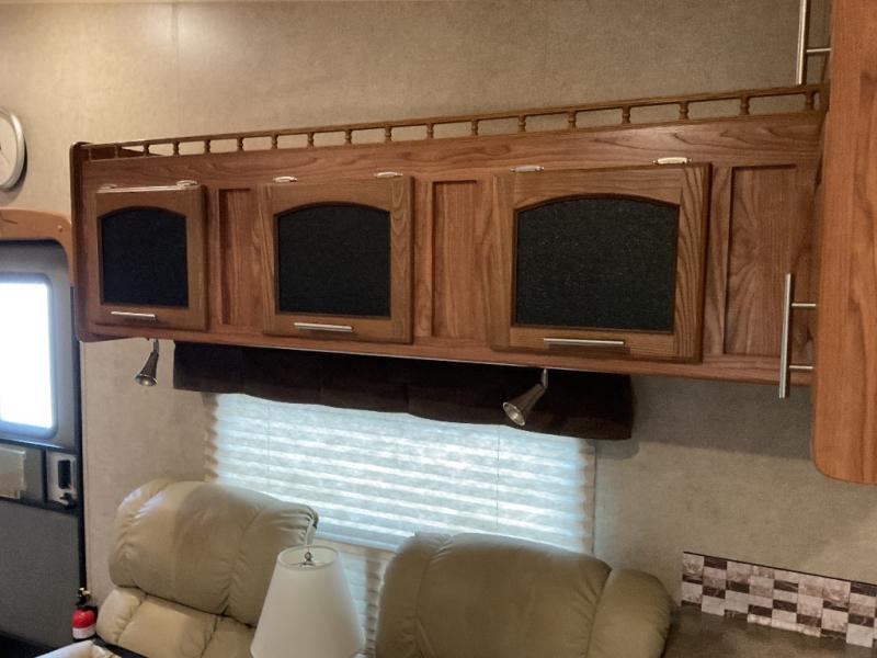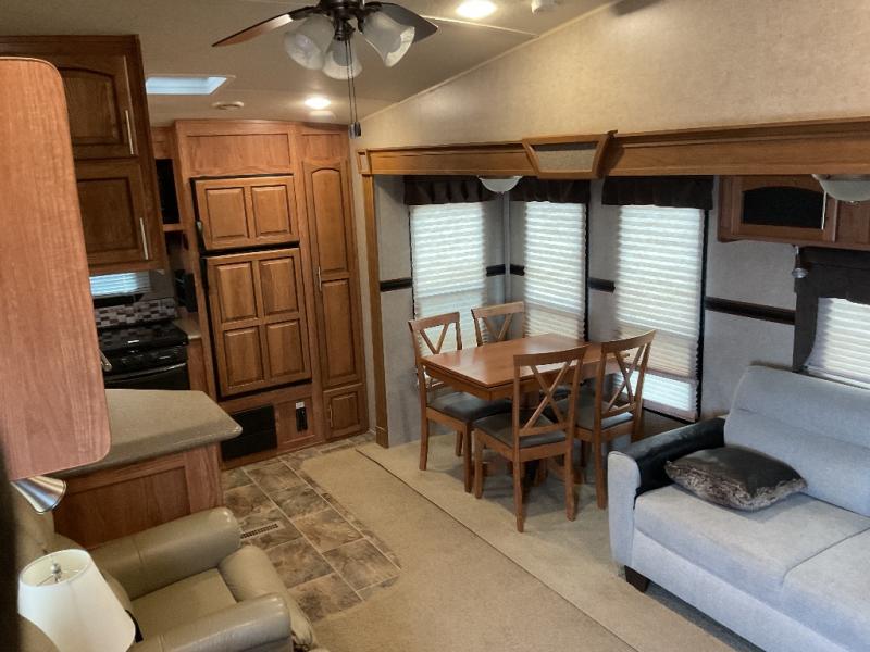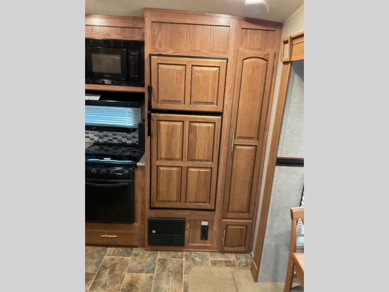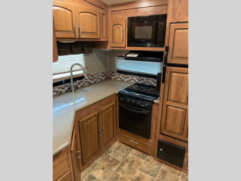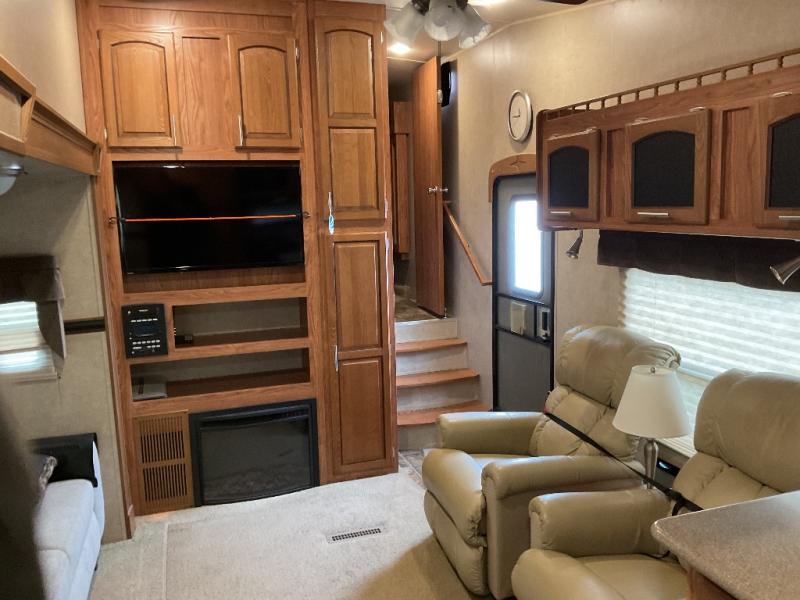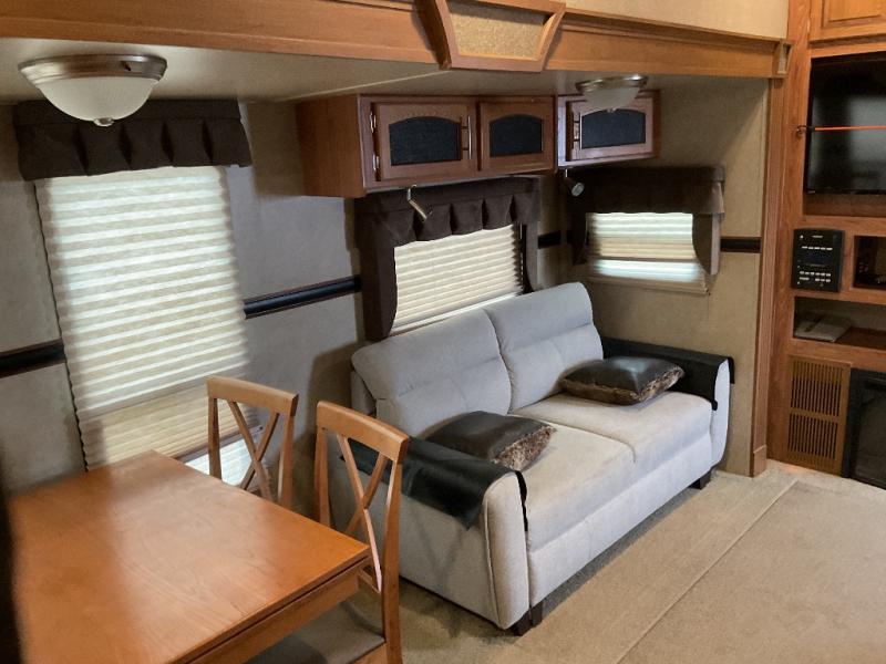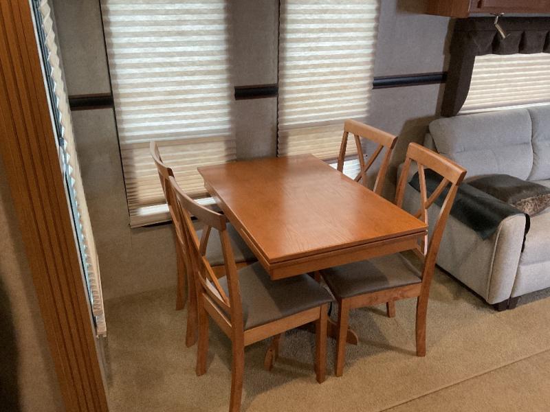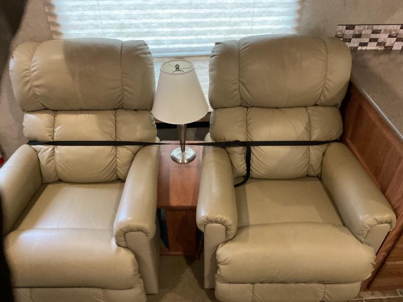 Stepping inside the fifth wheel, to the left there is a slide with two chairs and an end table with a lamp, or you can choose an optional theater seating. The opposite side of the fifth wheel offers a slide with a dinette and a hide-a-bed sofa. Next to the slide you will find an entertainment center and storage.