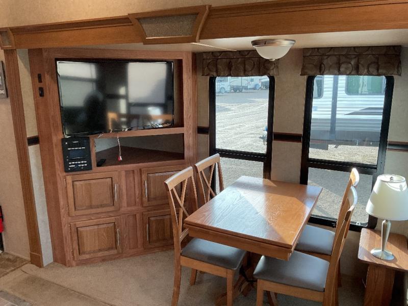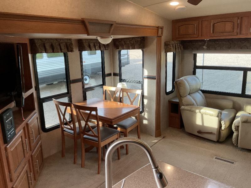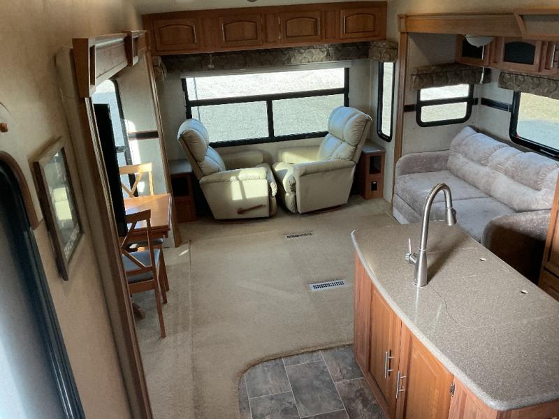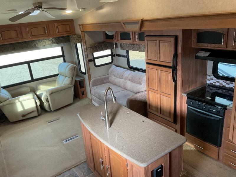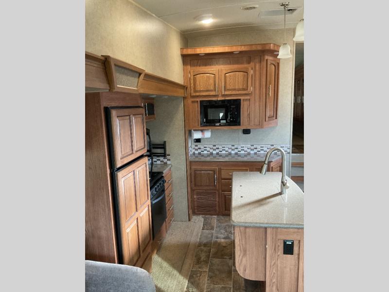 As you enter the fifth wheel, to the left there is a slide with a corner entertainment center with an optional fireplace below, and a free-standing table and chairs. Along the rear wall there are two chairs, or you can choose optional recliners, and three end tables. One of the end tables has a lamp. The other slide has a hide-a-bed sofa, refrigerator, and three burner range. Next to the slide you will find a microwave and pantry. The kitchen island offers a large sink and extra counter space.