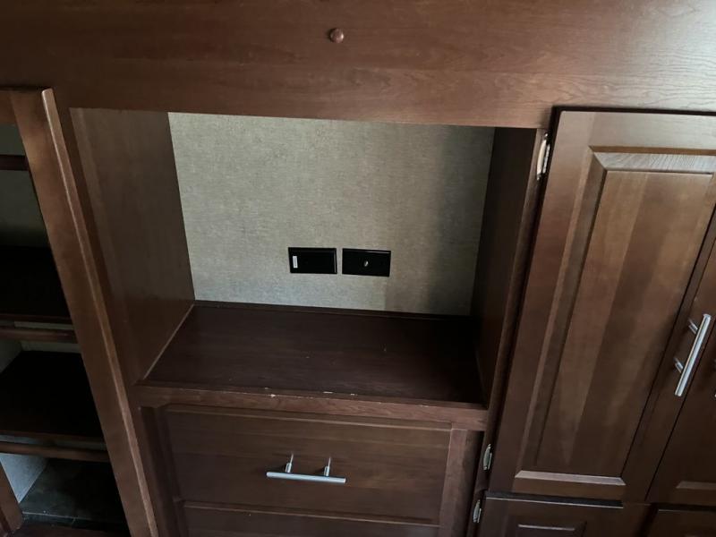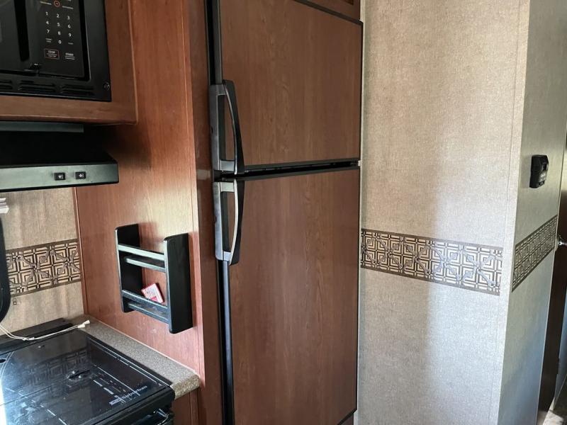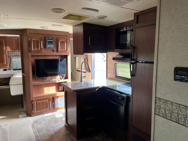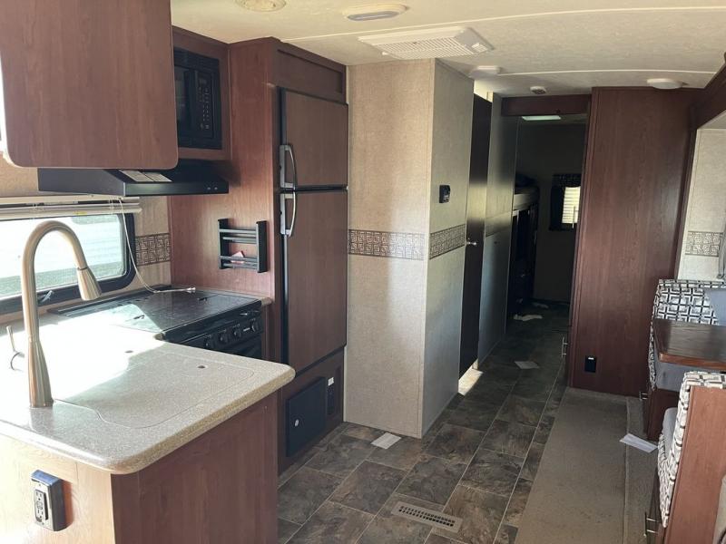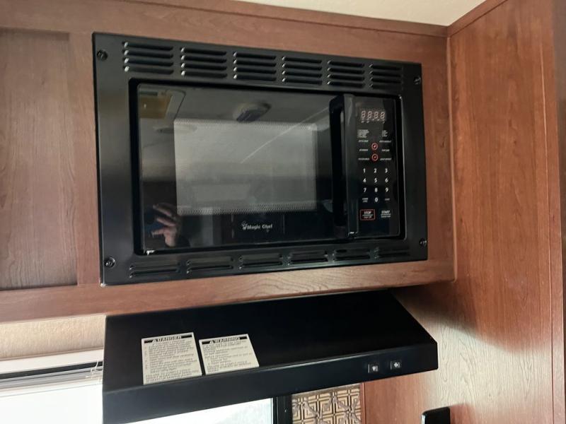 You will find plenty of storage in the travel trailer with all of the overhead cabinets, and the large exterior pass thru storage area. You can enjoy the outside kitchen which offers a two burner range, pantry, microwave, and refrigerator. There is even an optional grill and an optional rear ladder that you can choose.