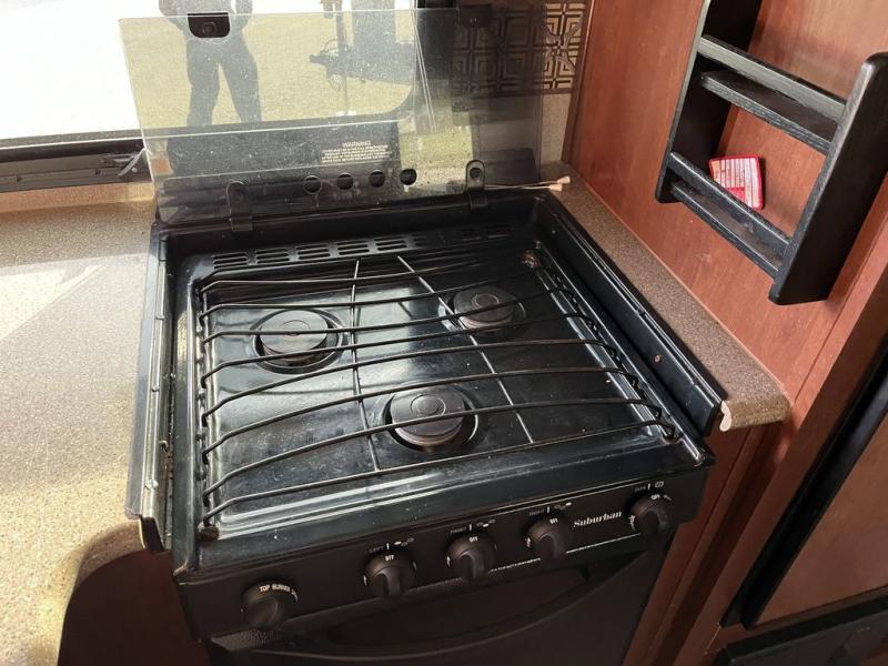 As you enter the travel trailer, to the left there is a double kitchen sink, three burner range, microwave, and refrigerator. On the opposite side of the trailer there is a slide with a dinette and a hide-a-bed sofa. Along the front of the living/kitchen area you will find an entertainment center.