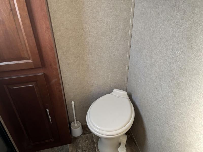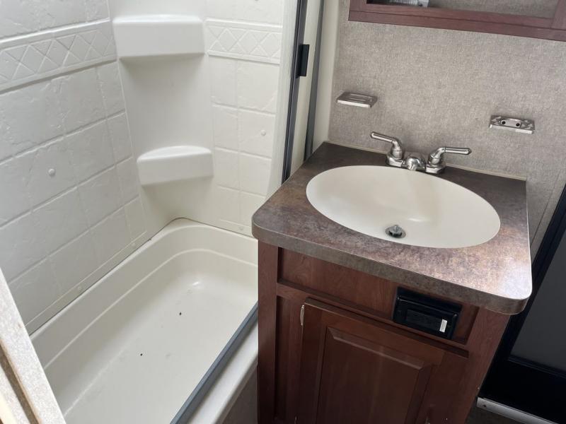 Towards the rear of the trailer, the bathroom is on the left. Inside the bathroom you will find a tub/shower, sink, linen cabinet, toilet, and a private entrance outside.