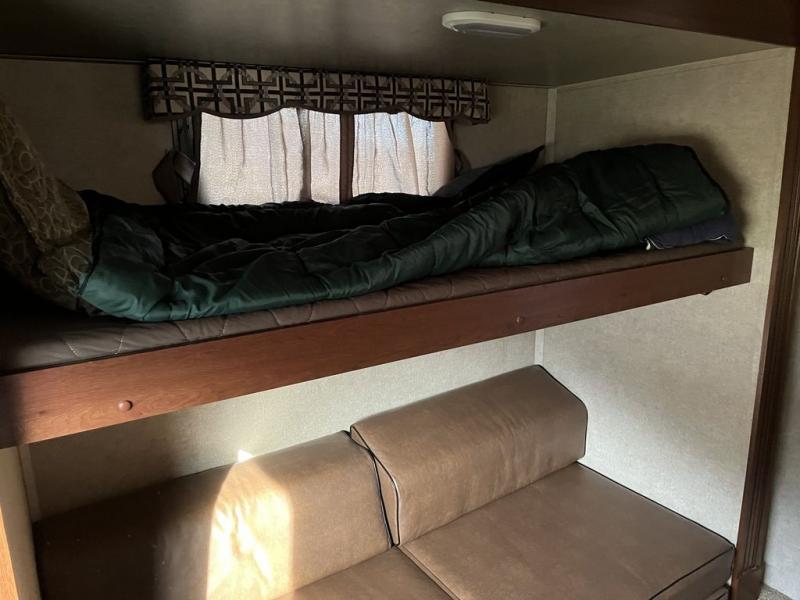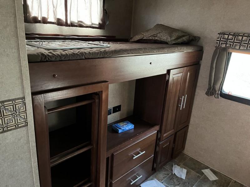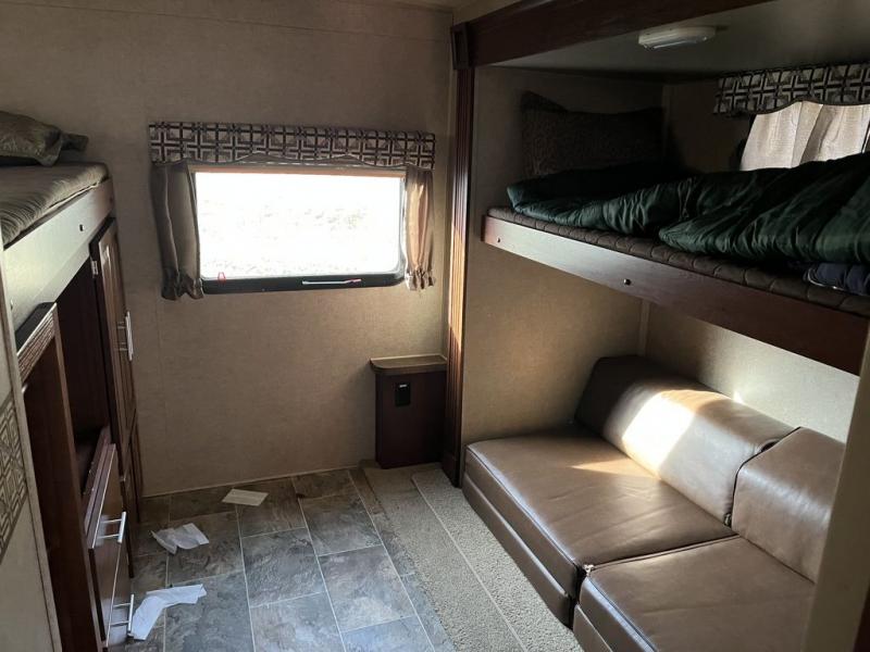 The bunk house offers a slide with a set of bunks, or an optional sofa on the bottom. Across from the slide there is a bunk on top and a closet, set of drawers, and an optional TV.