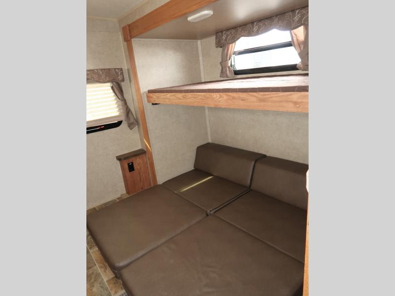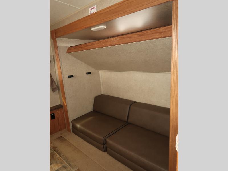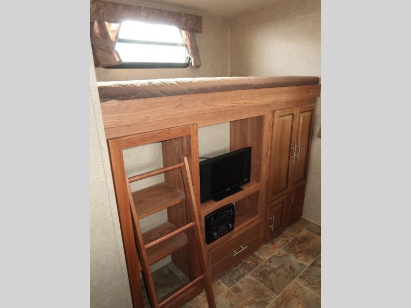 The bunk house offers a slide with a set of bunks, or an optional sofa on the bottom. Across from the slide there is a bunk on top and a closet, set of drawers, and an optional TV.