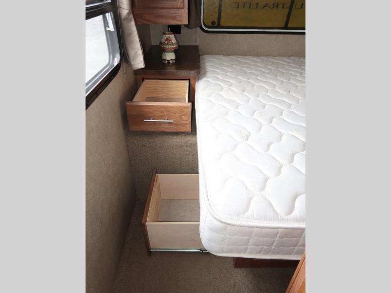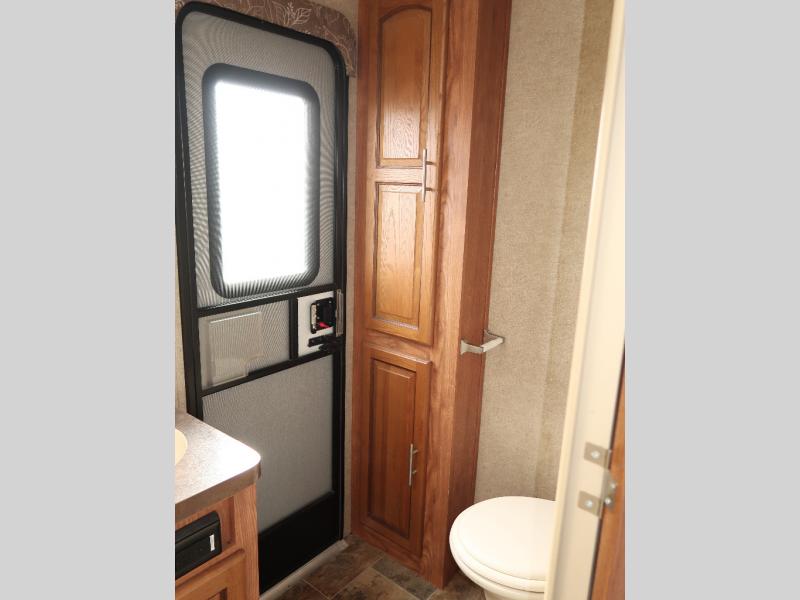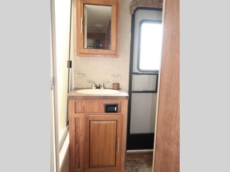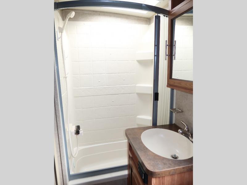 Towards the rear of the trailer, the bathroom is on the left. Inside the bathroom you will find a tub/shower, sink, linen cabinet, toilet, and a private entrance outside.