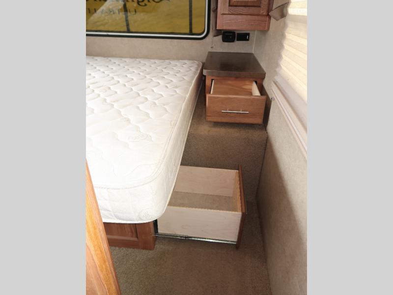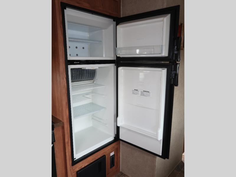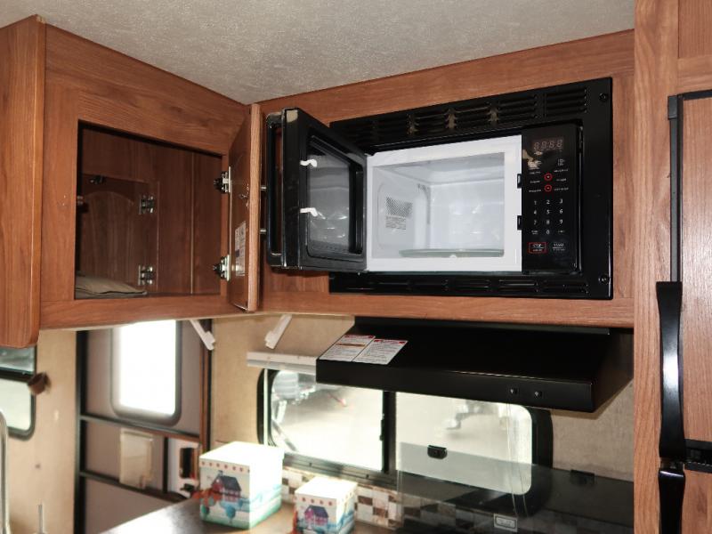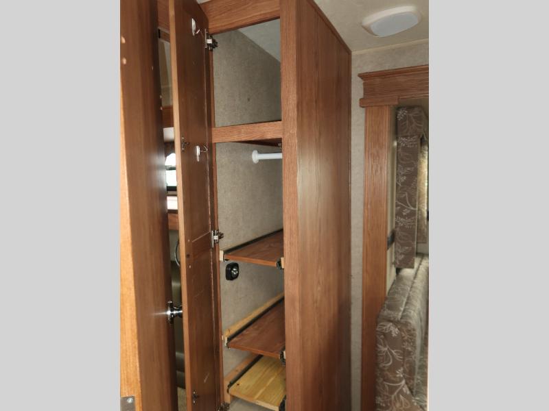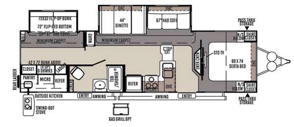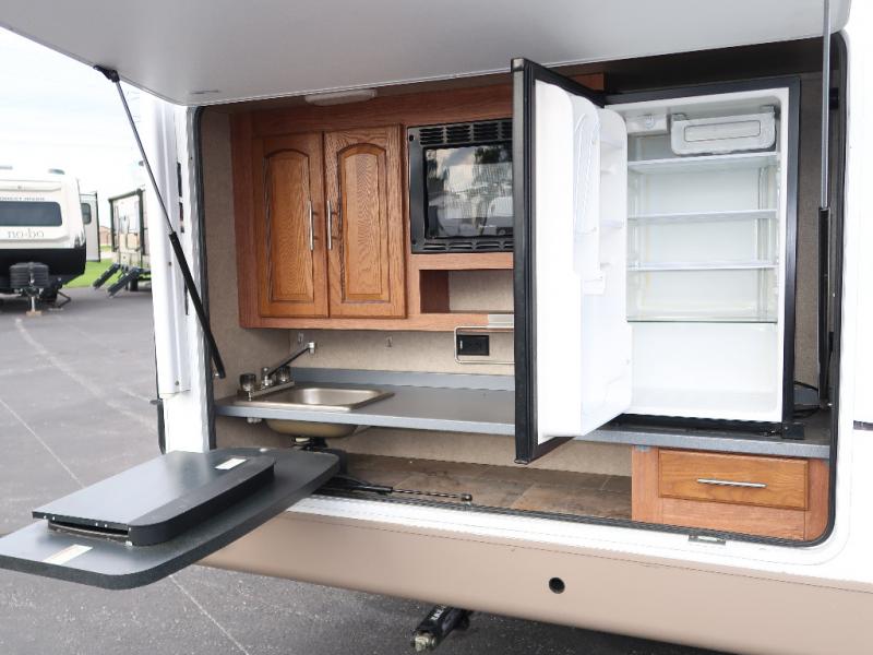 You will find plenty of storage in the travel trailer with all of the overhead cabinets, and the large exterior pass thru storage area. You can enjoy the outside kitchen which offers a two burner range, pantry, microwave, and refrigerator. There is even an optional grill and an optional rear ladder that you can choose.