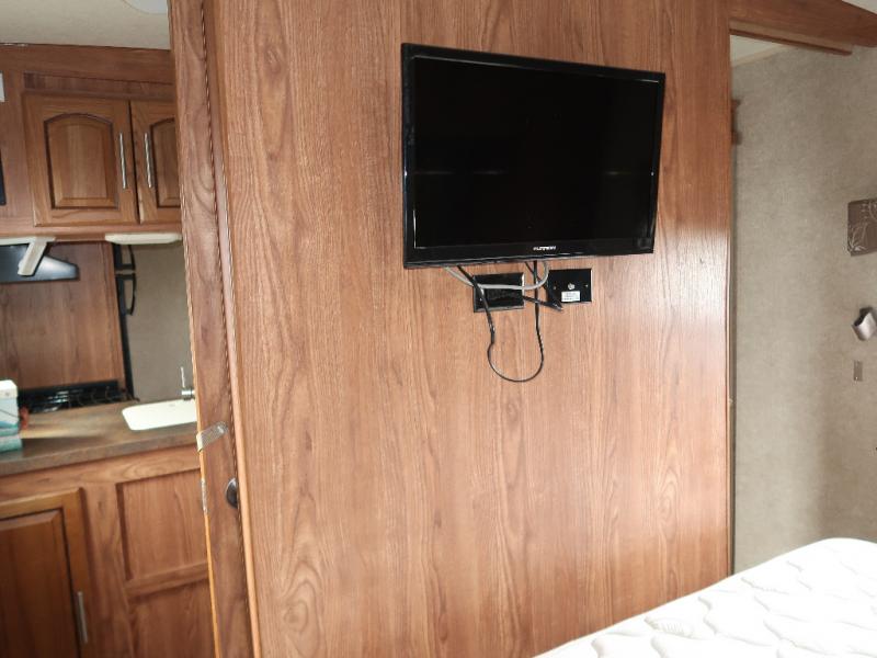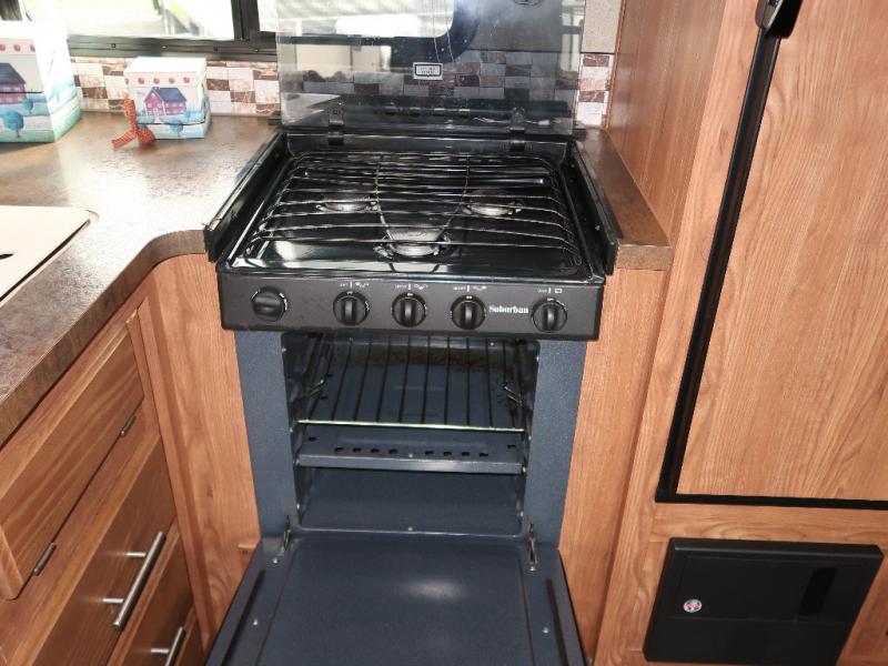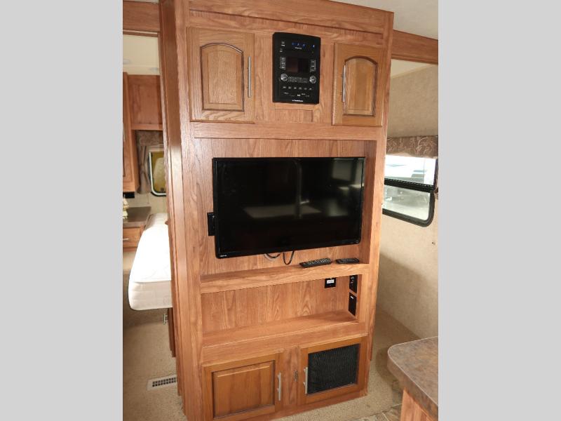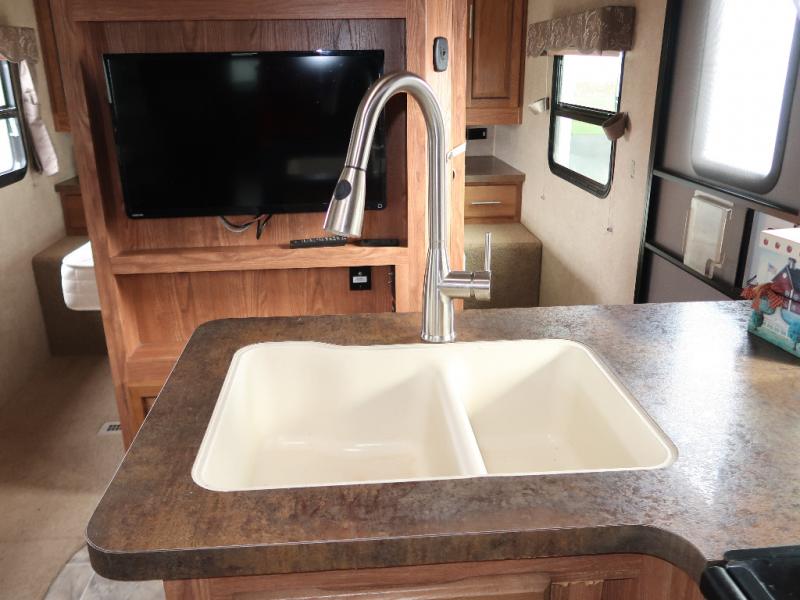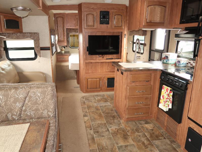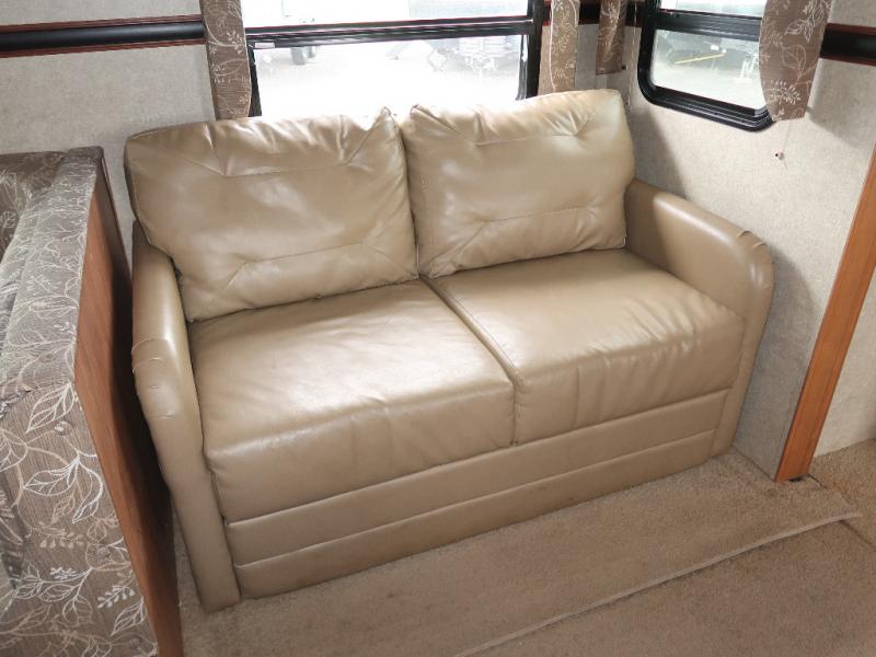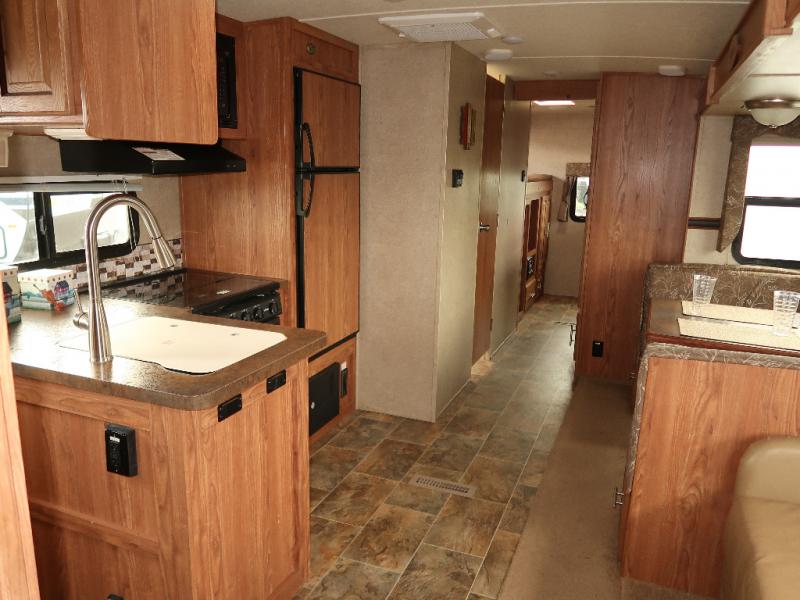 As you enter the travel trailer, to the left there is a double kitchen sink, three burner range, microwave, and refrigerator. On the opposite side of the trailer there is a slide with a dinette and a hide-a-bed sofa. Along the front of the living/kitchen area you will find an entertainment center.