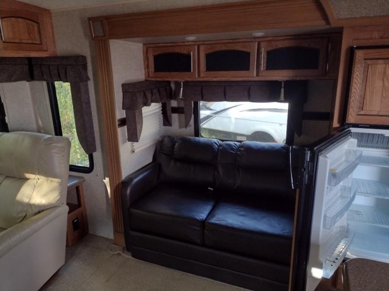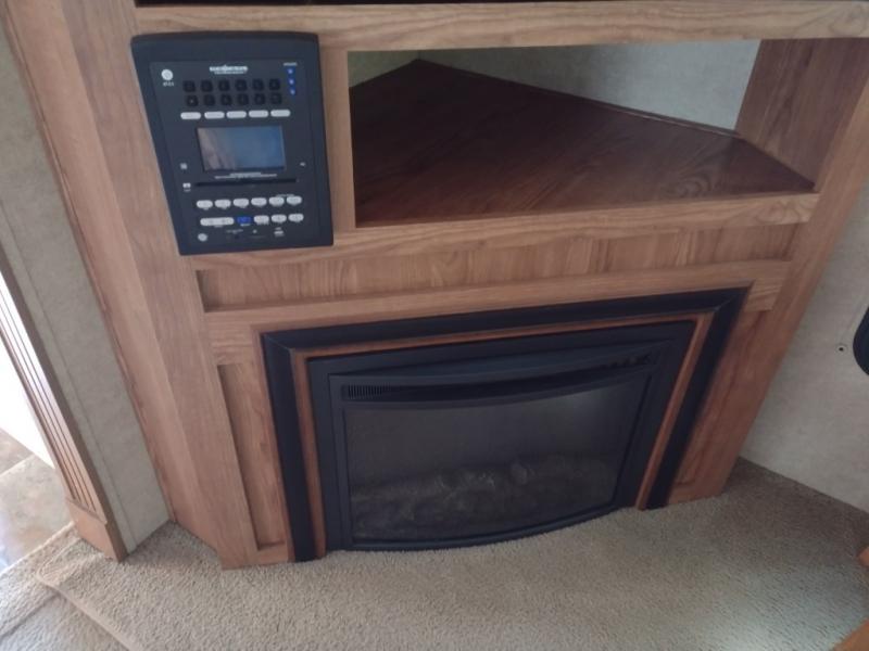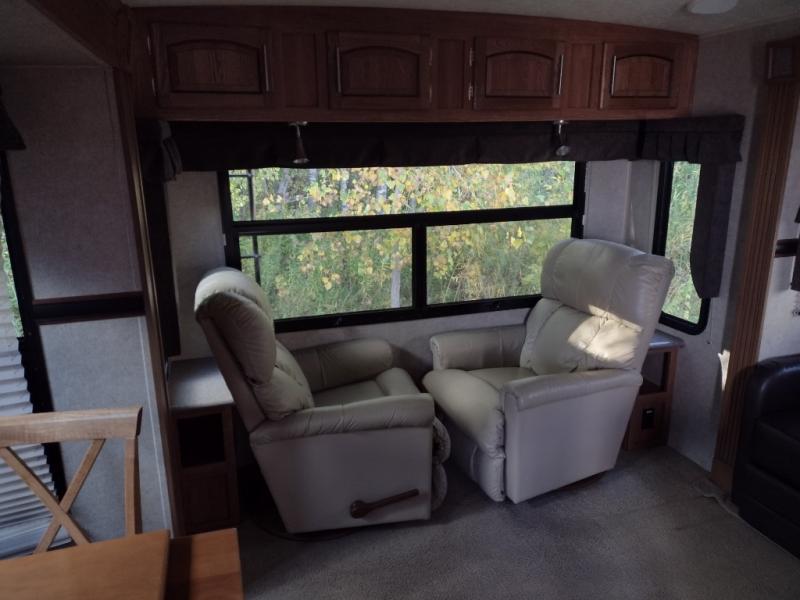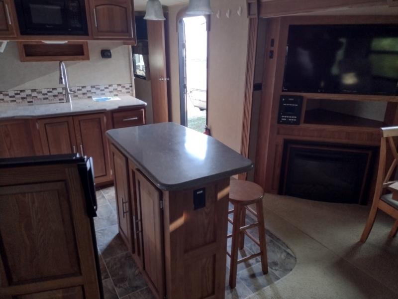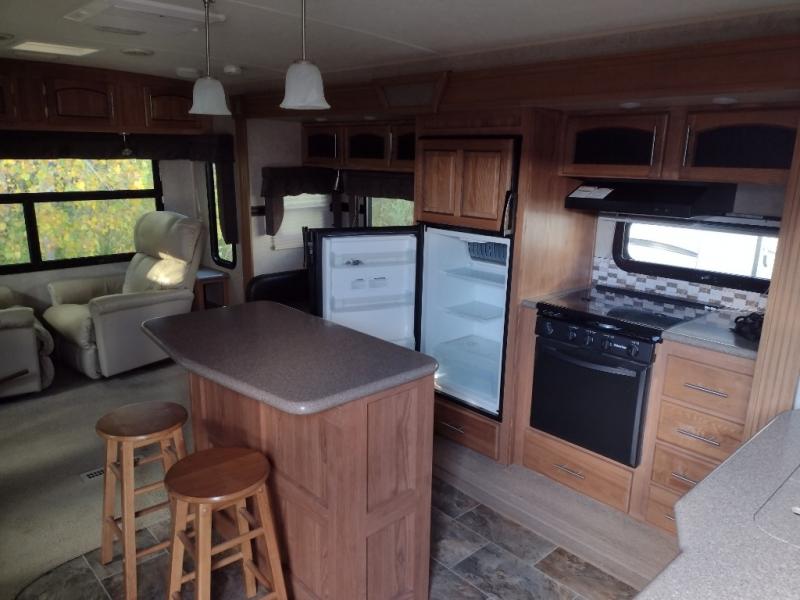 To the left of the entrance you will find a slide with a corner entertainment center and a free-standing table and chairs. Along the rear wall there are two chairs and three end tables, or you can choose optional recliners. The other slide has a hide-a-bed sofa, refrigerator, and three burner range. You will also find a large kitchen sink surrounded by extra counter space. The kitchen island is a great place to fix your meals. There are two bar stools that pull up to the island.