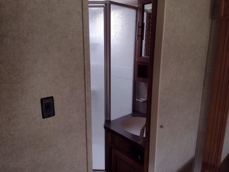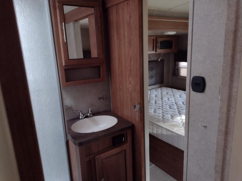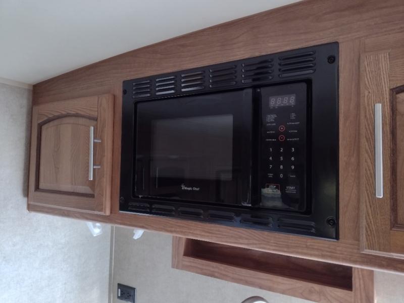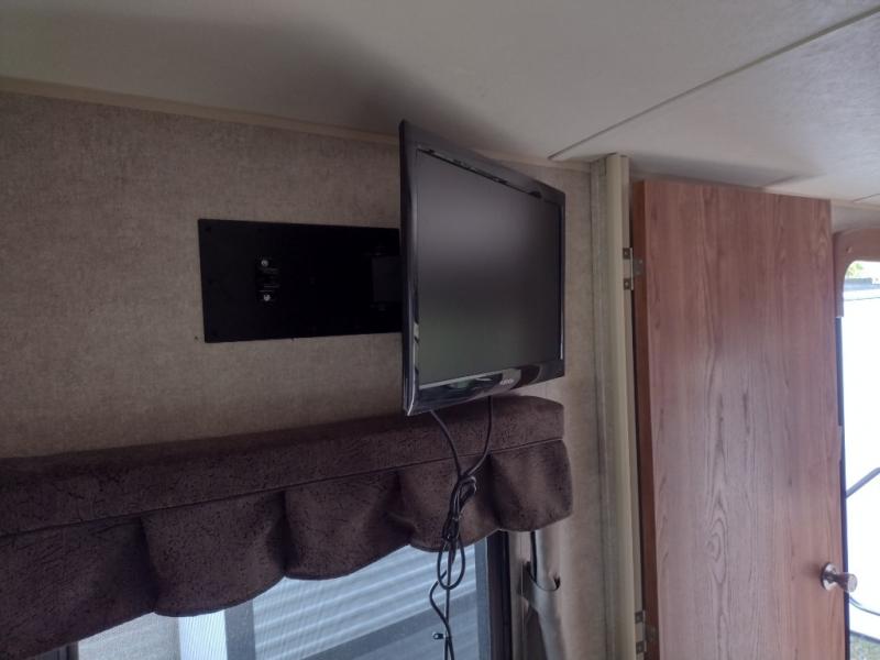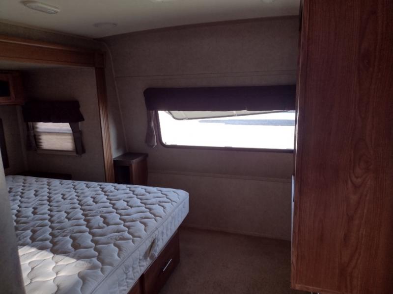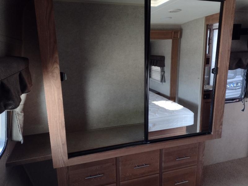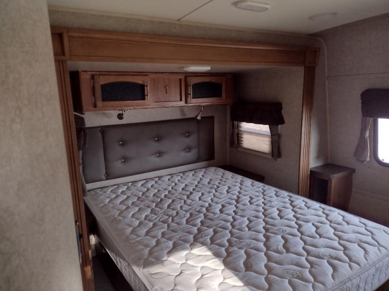 The front bedroom offers a queen bed slide with nightstands on either side of the bed. Across from the bed you will find a large wardrobe and an optional wall mount TV.
