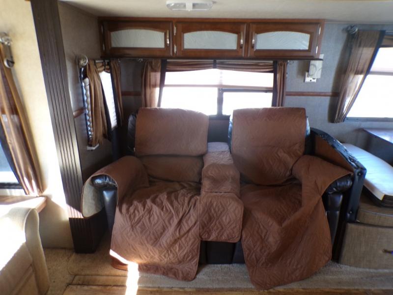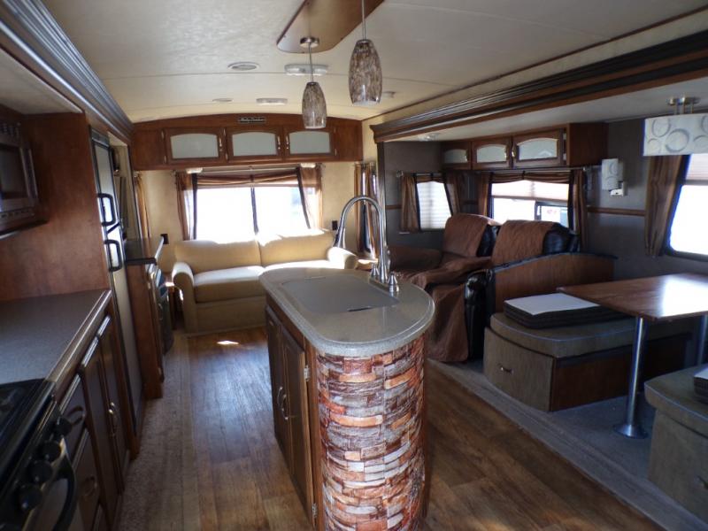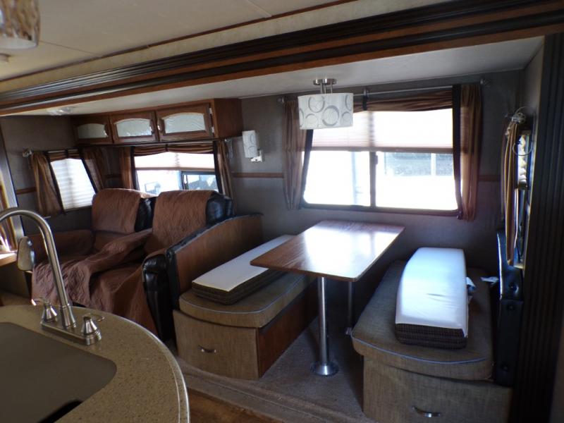 As you enter the 272RLIS, to the left is a slide with a three burner range, microwave, lots of counter space, refrigerator, and entertainment center. Along the rear wall you will find a hide-a-bed sofa and end tables. The other slide has theater seating and a dinette. In the middle of the kitchen there is a kitchen island with a double kitchen sink.