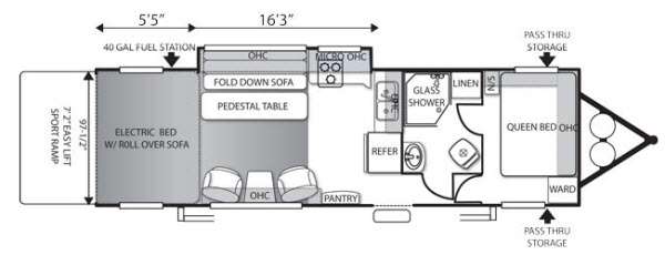 Outside you will find an awning, front pass thru storage, a rear easy lift sport ramp and a 40 gallon fuel station at the rear road side.