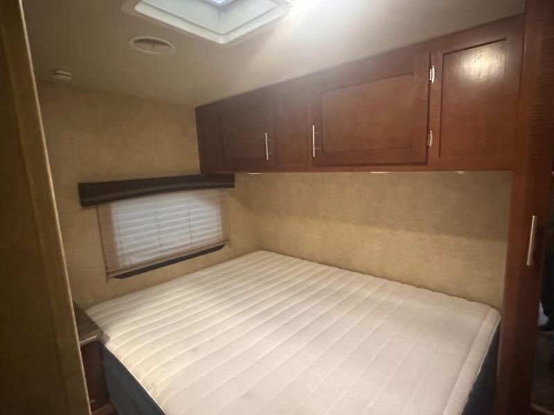 The front private bedroom includes a corner queen bed with a nightstand at one side, overhead cabinets over two sides and a wardrobe at the foot of the bed as well as private entry into the bathroom.