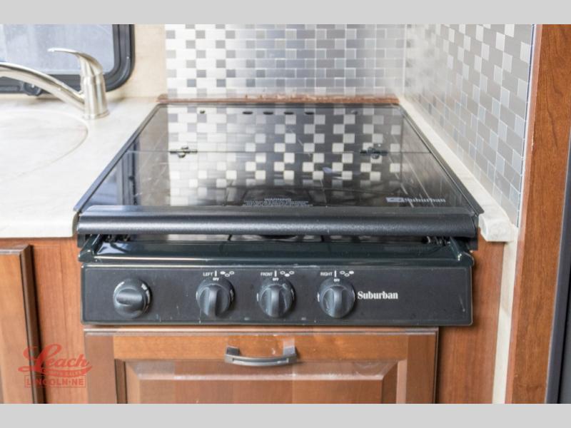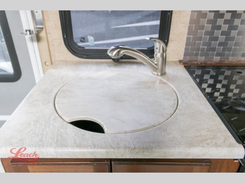 One side of the motor home has a flip-on counter, single sink, three burner range, and refrigerator. The opposite side features a dinette slide.