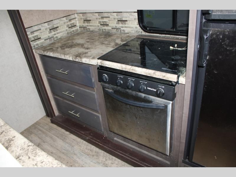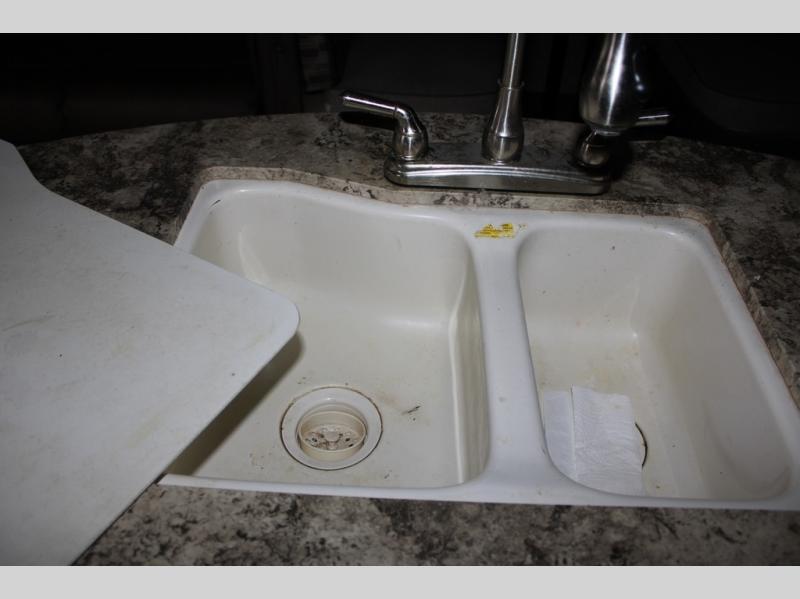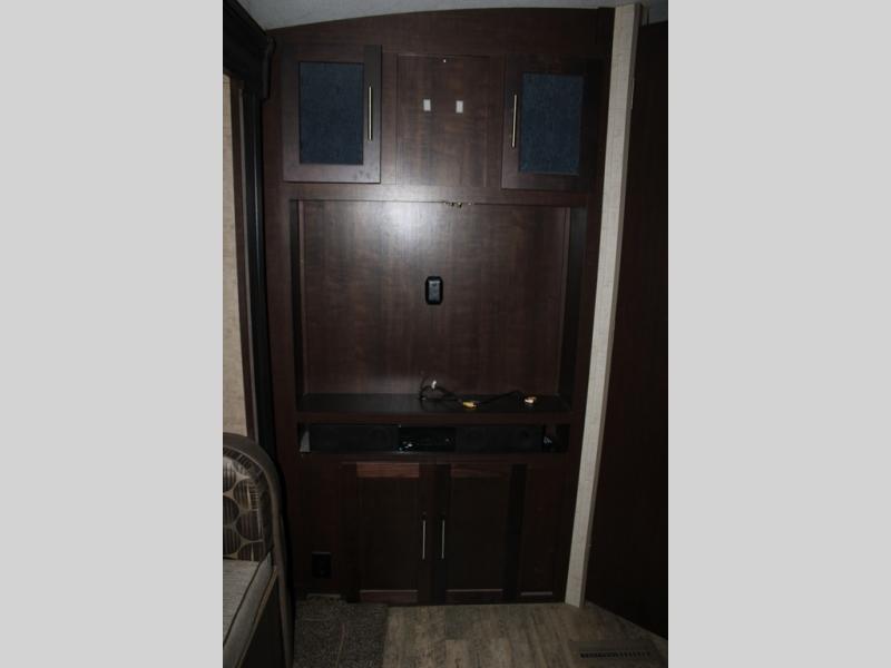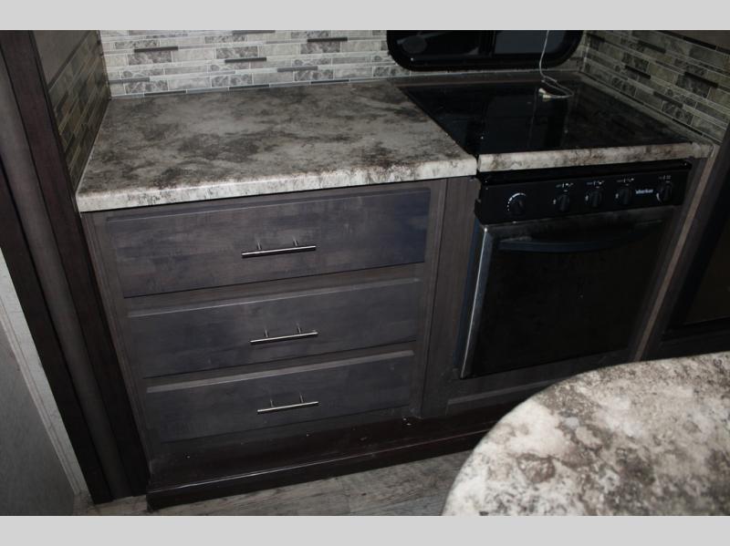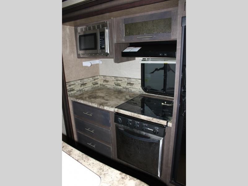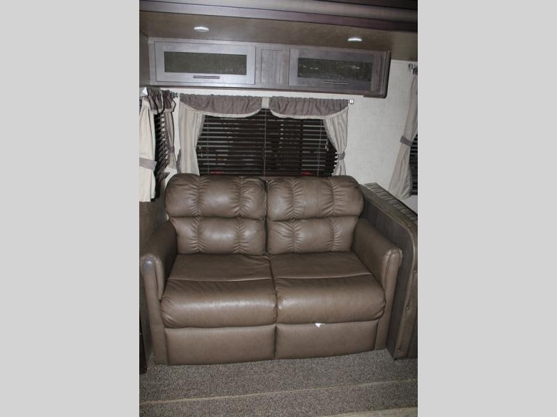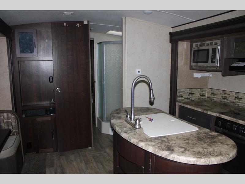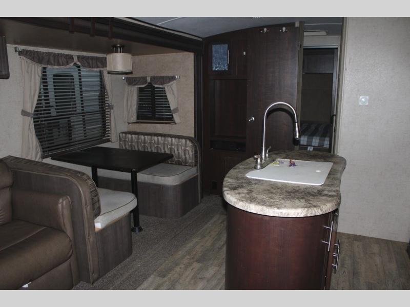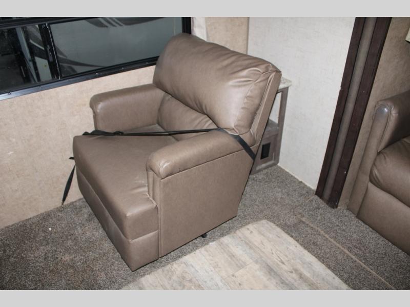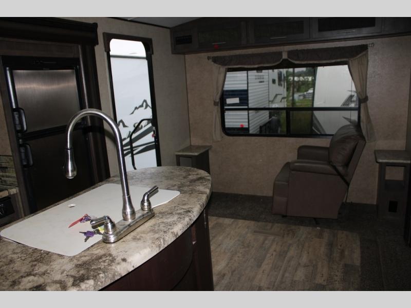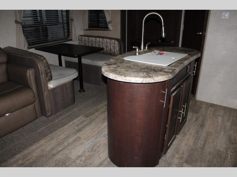 As you enter the travel trailer, along the rear wall there are two lounge chairs and nightstands on either side of the chairs. The slide has a sofa and dinette. Next to the dinette you will find an entertainment center. On the opposite side of the travel trailer there is a slide with a refrigerator, three burner range, and extra counter space. You will also enjoy the convenience of the kitchen island which also has the double kitchen sink.