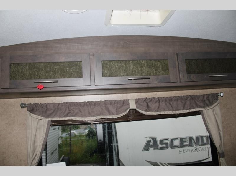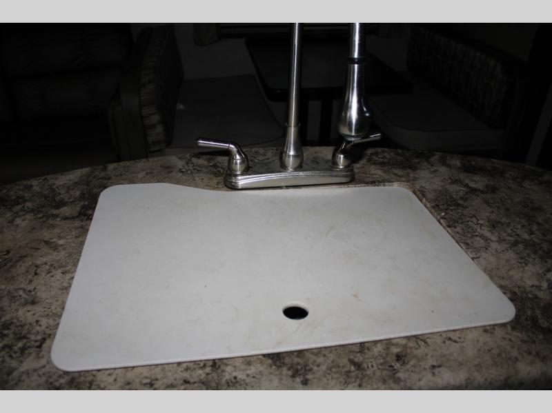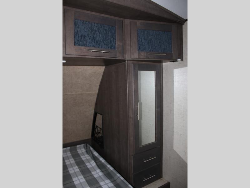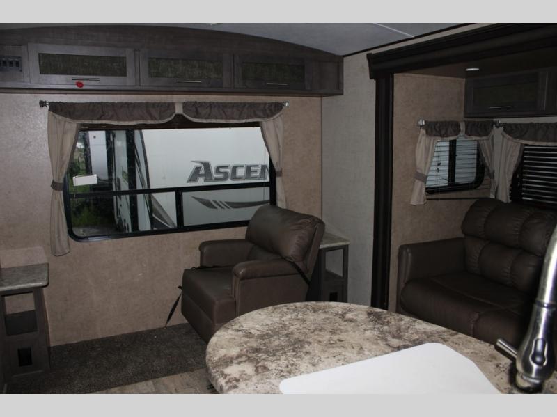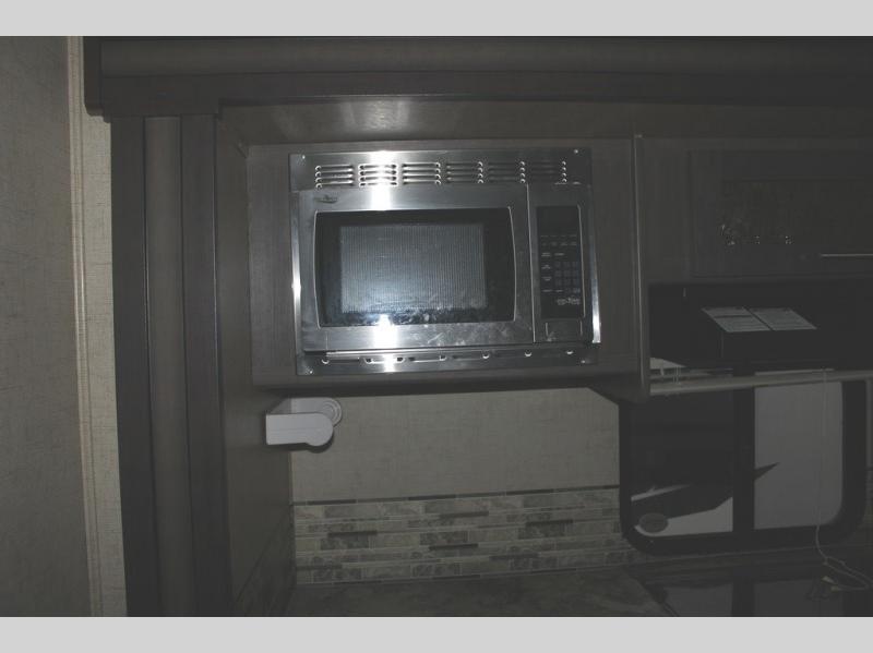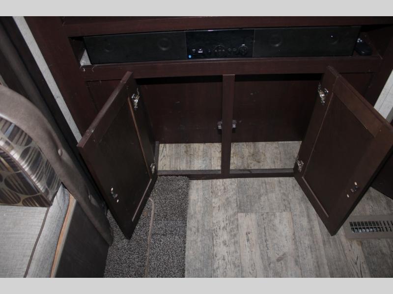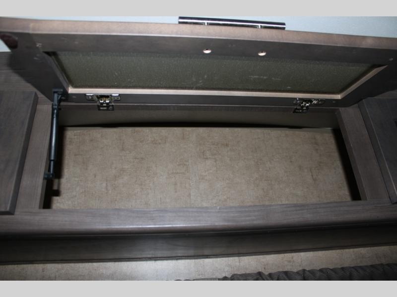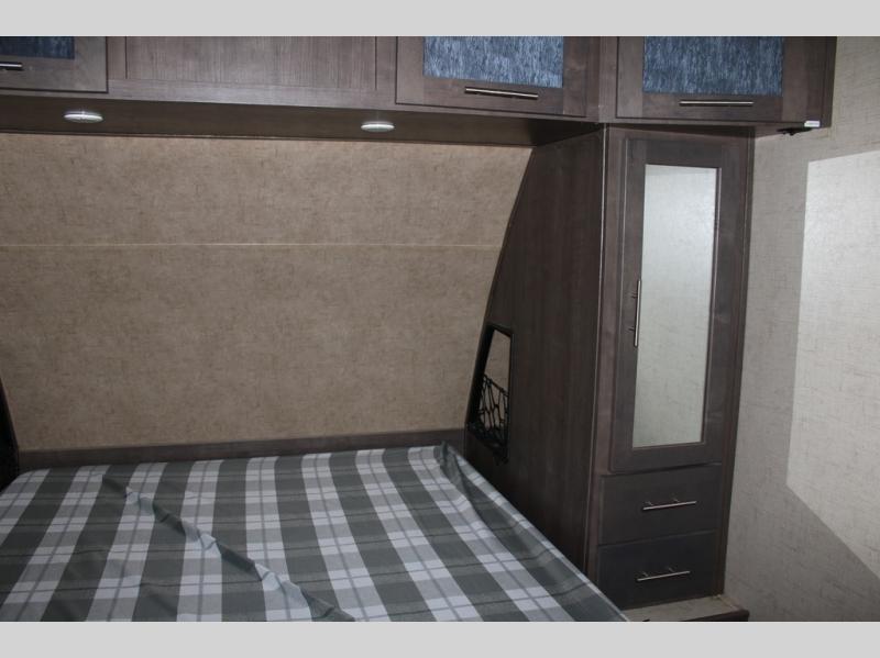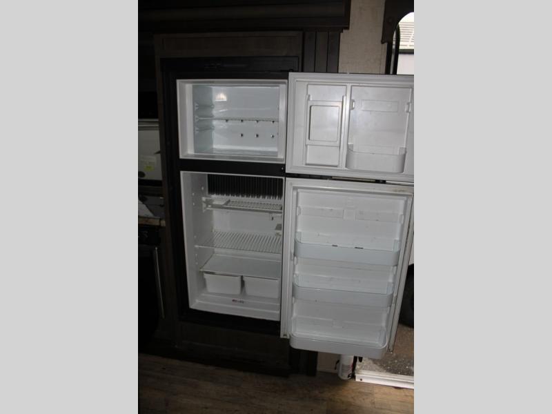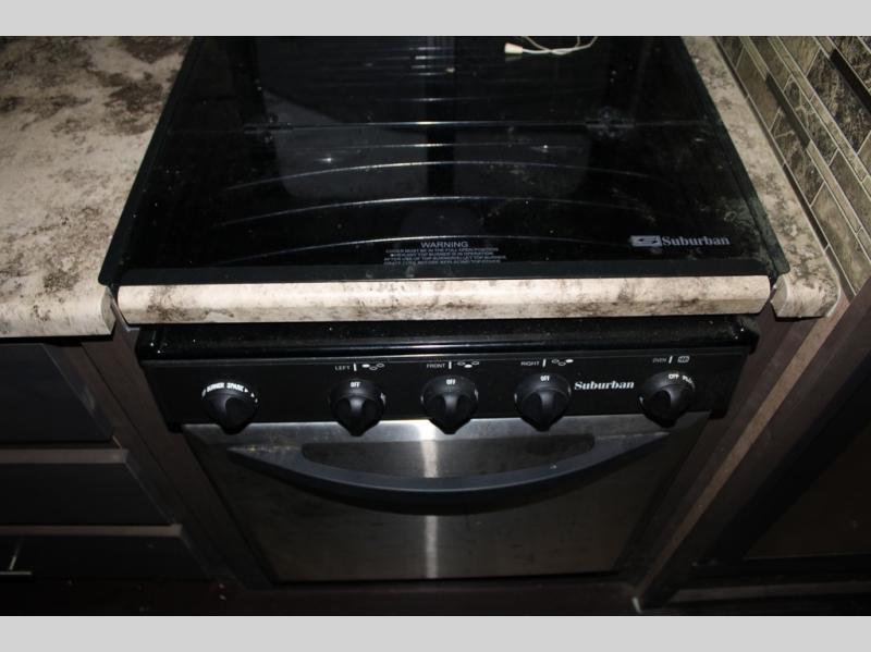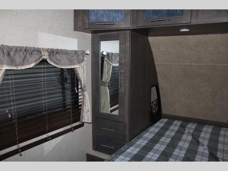 As you enter the travel trailer, along the rear wall there are two lounge chairs and nightstands on either side of the chairs. The slide has a sofa and dinette. Next to the dinette you will find an entertainment center. On the opposite side of the travel trailer there is a slide with a refrigerator, three burner range, and extra counter space. You will also enjoy the convenience of the kitchen island which also has the double kitchen sink.