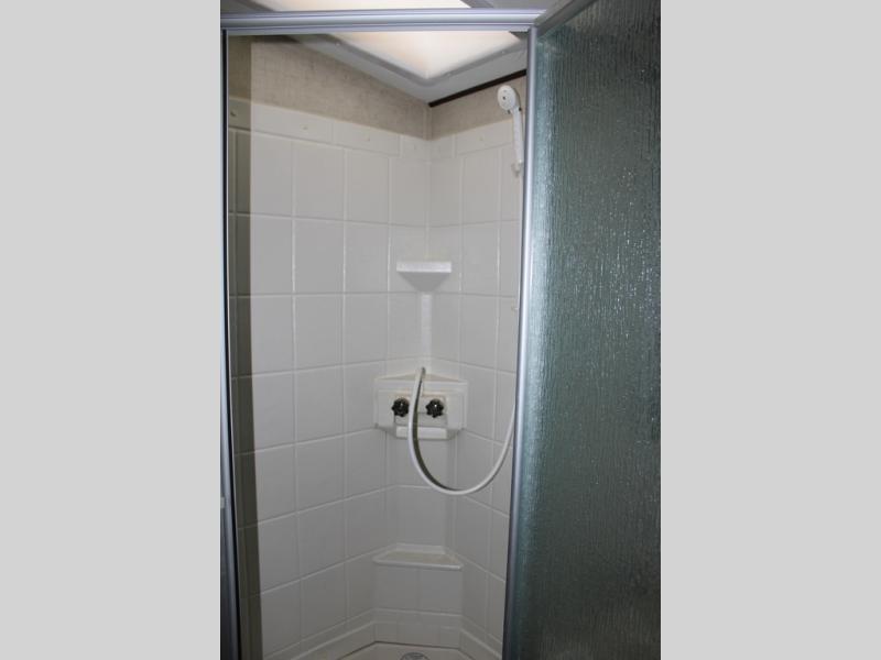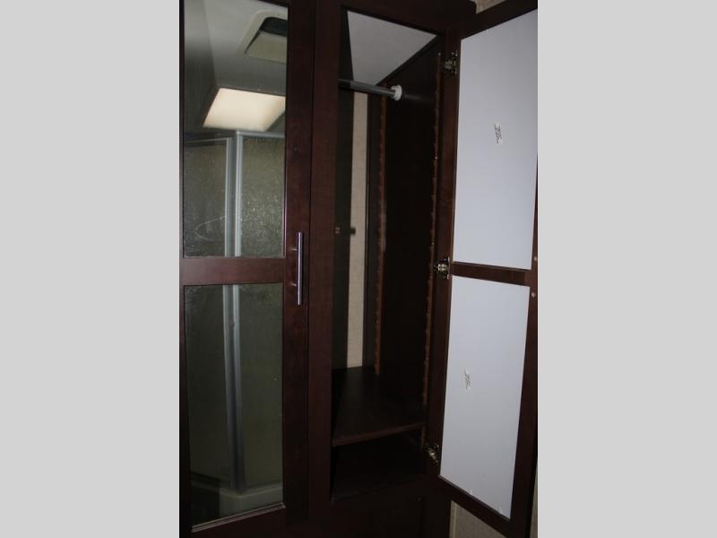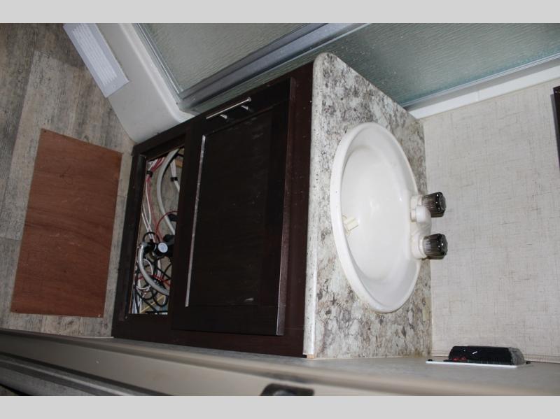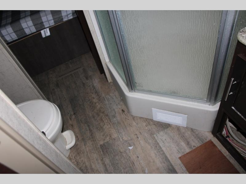 The bathroom is a walk-thru with a sink and shower on one side of the trailer and a toilet and a linen cabinet on the other side.