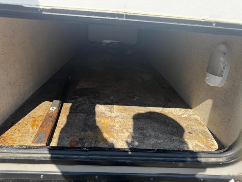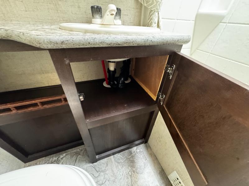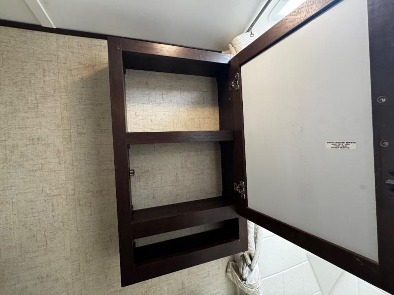 Proceeding toward the front of the trailer, the bathroom is on the right side. Inside the bathroom you will find a toilet, sink, medicine cabinet, and tub/shower.