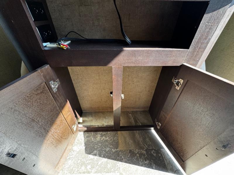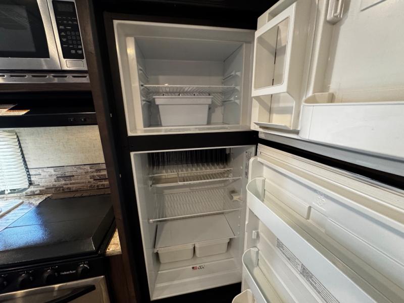 The kitchen area has a refrigerator, three burner range, and double kitchen sink along one side of the trailer. The opposite side has a slide which helps to open up the floor space. On the slide there is a sofa and u-dinette, and adjacent to the dinette there is a pantry for your dry goods. Along the front of the kitchen/living area you are sure to enjoy the entertainment center.