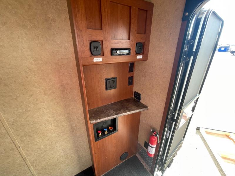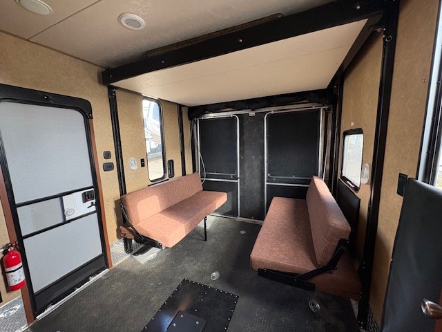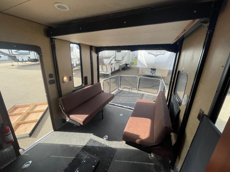 In the rear, there is a flip-up sofa and free standing table. In the corner you will find a TV mount and washer and dryer prepped. You can easily load and unload your off-road toys with the large ramp door. As you leave the cargo area, there is a private entrance door, which is convenient to help separate the cargo area from the main living area.