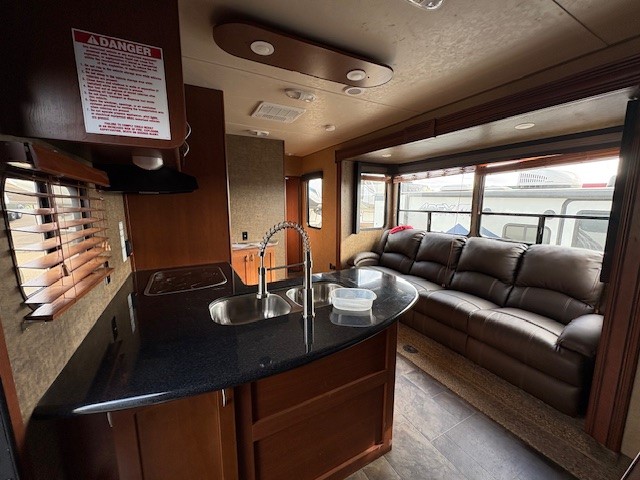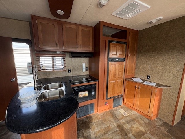 In the kitchen area you will find a pantry, refrigerator, three burner range, microwave, and a double kitchen sink. There is a bit more counter space which is nice for storage or food preparation.