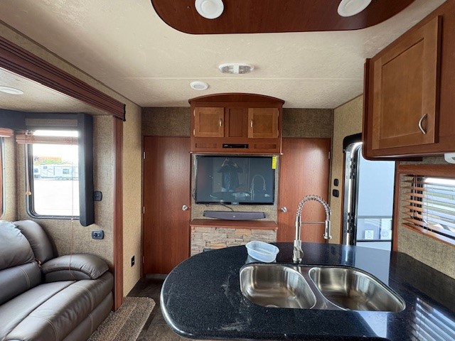 You won't be lacking for storage space with all of the overhead cabinets throughout the model, as well as the pass thru storage. Don't forget to check out the outside TV mount.