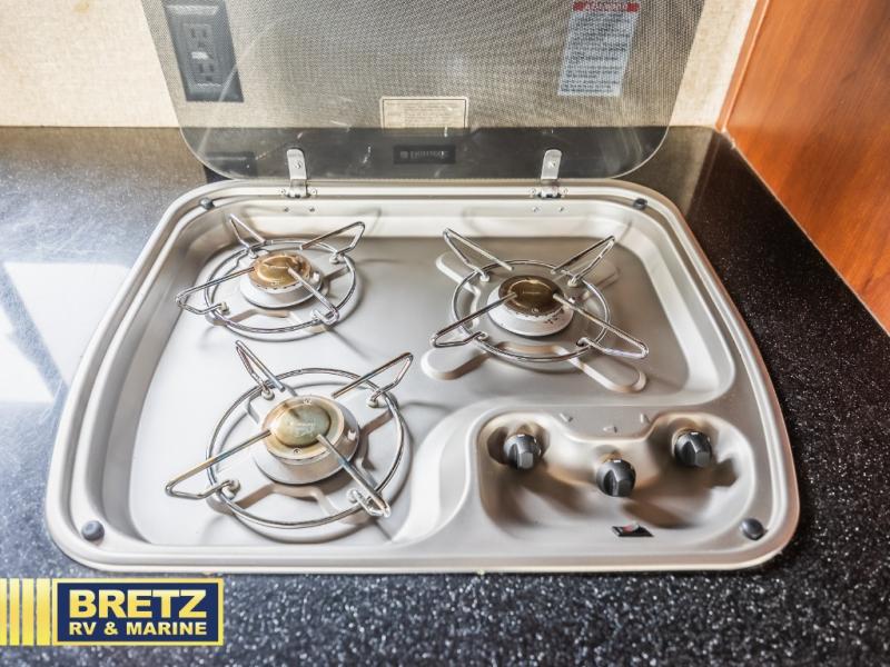 Stepping inside the main living area there is a refrigerator, three burner range, microwave, and double kitchen sink along one side. The other side of the fifth wheel has a slide with a sofa with recliners. You are also sure to enjoy the entertainment center with fireplace.