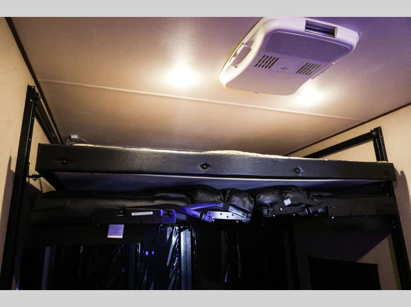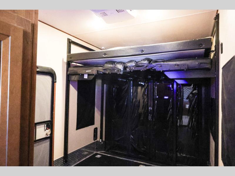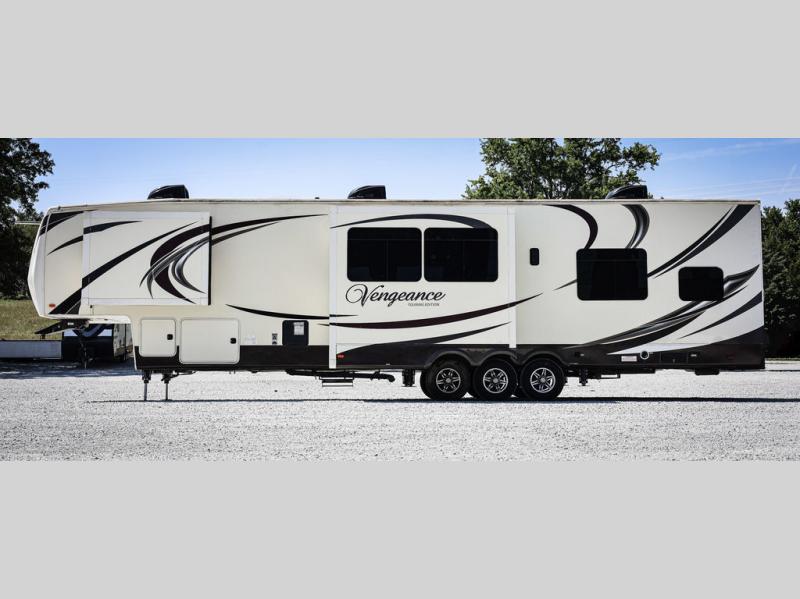 The Vengeance Touring Edition 39B12 toy hauler fifth wheel by Forest River offers triple slides and a large cargo area for your off road toys.
