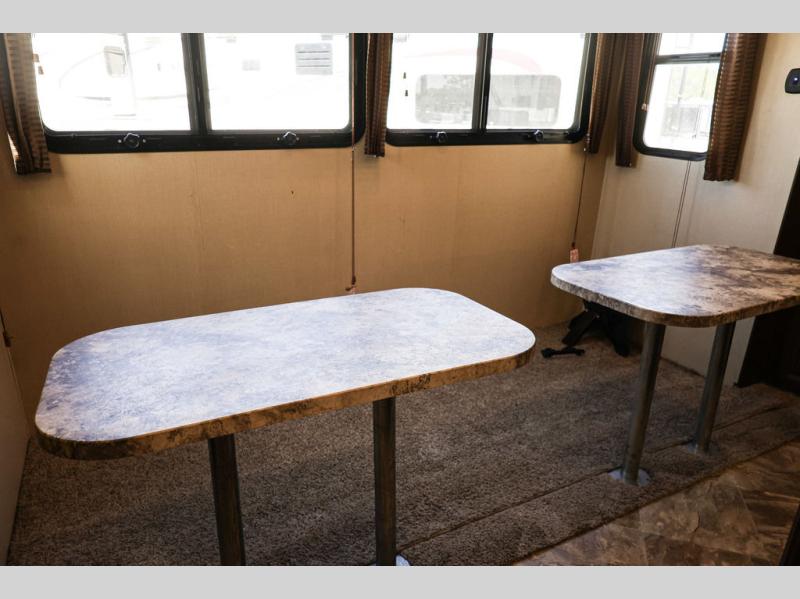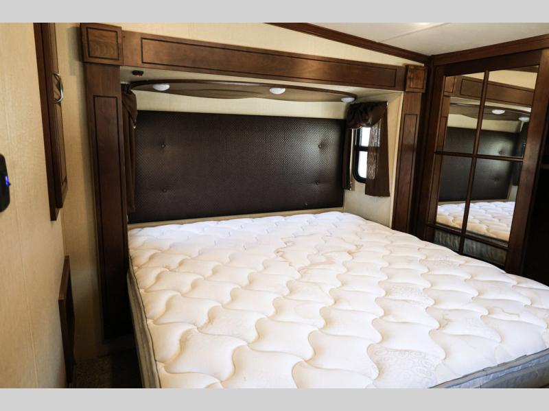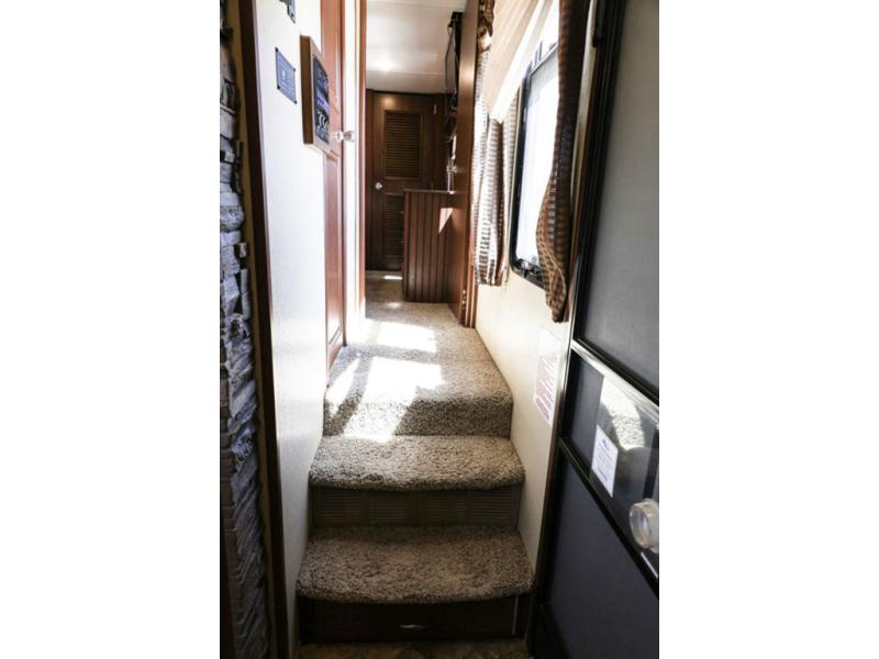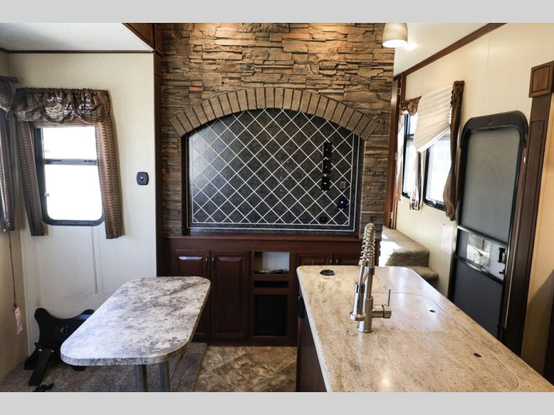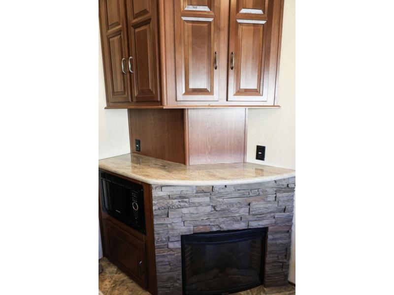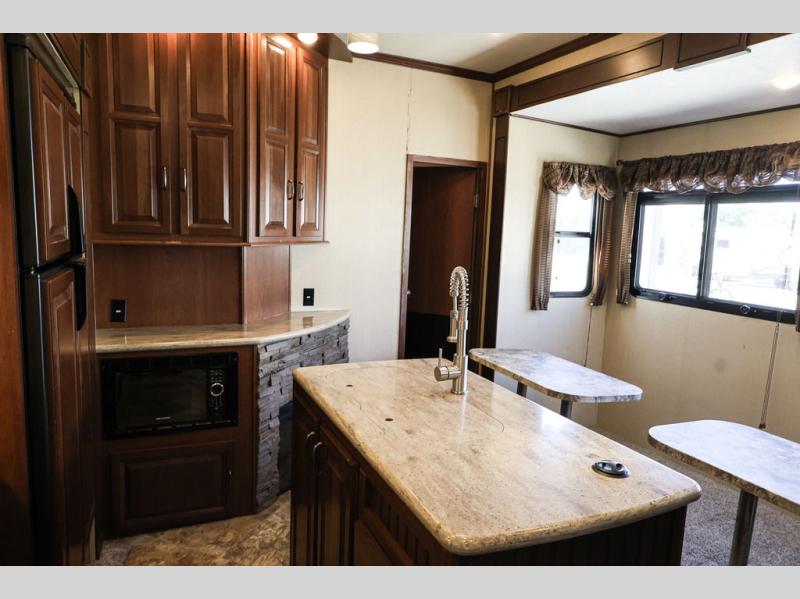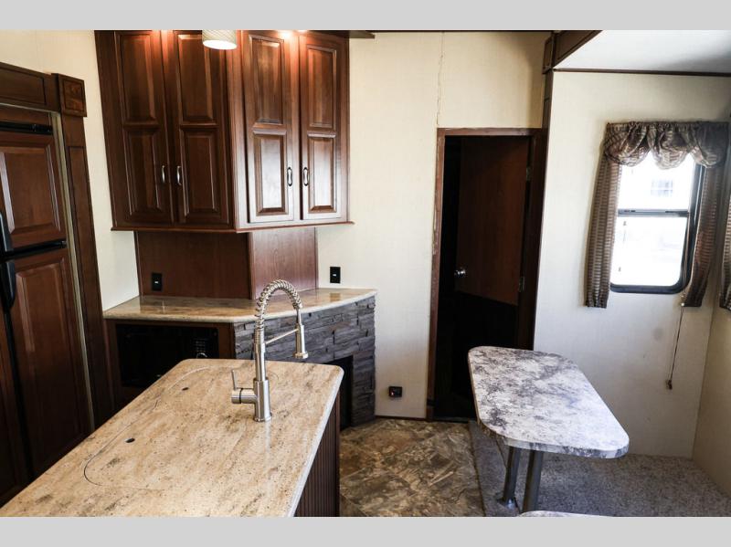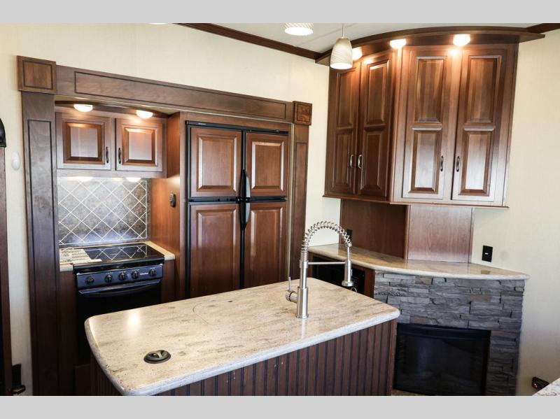 As you enter the fifth wheel, you will be in the main living and kitchen area. To the left of the entrance there is a slide with a three burner range and refrigerator. Next to the slide you will find a fireplace. The opposite side has a slide with theater seating. In the middle of the kitchen there is an island which has a kitchen sink and extra counter space.