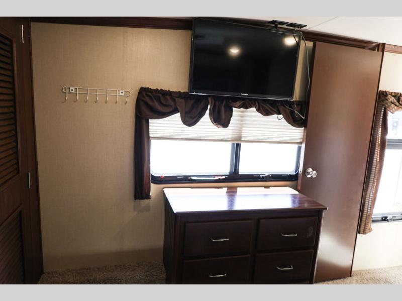 The front bedroom offers a king bed slide, dresser, and a front wall wardrobe with a washer and dryer prep.