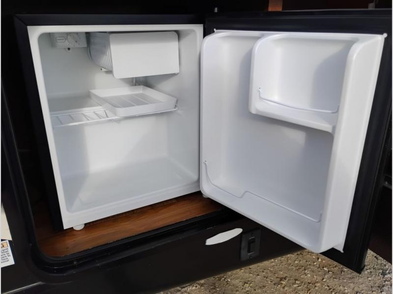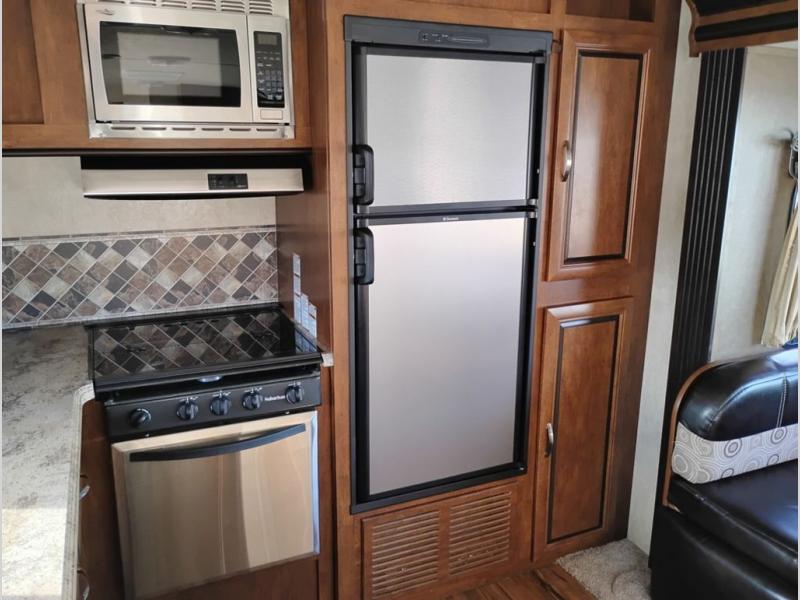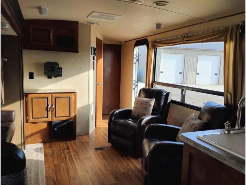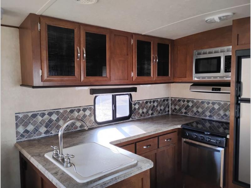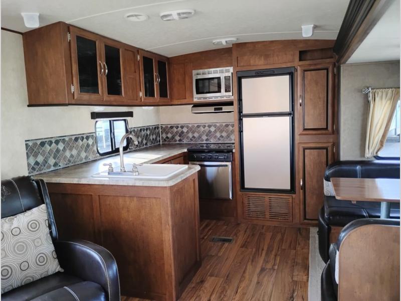As you enter the Vibe Extreme Lite 268RKS travel trailer by Forest River you will find that the kitchen is located in the rear. Your eyes will travel to the wrap around counter with a double kitchen sink, and lots of counter space. Along the rear of the trailer you will also find a three burner range, microwave, refrigerator, and pantry. The slide is along one side of the trailer and there is a dinette, and jiffy sofa. Next to the slide you will find an entertainment center. To the left of the entrance are two comfortable lounge chairs.