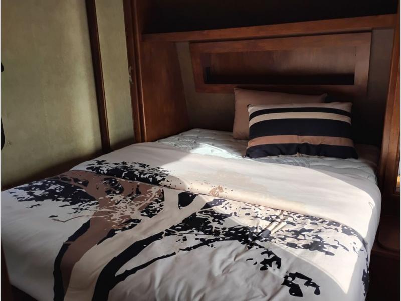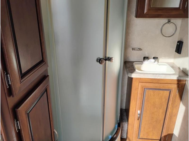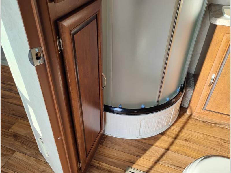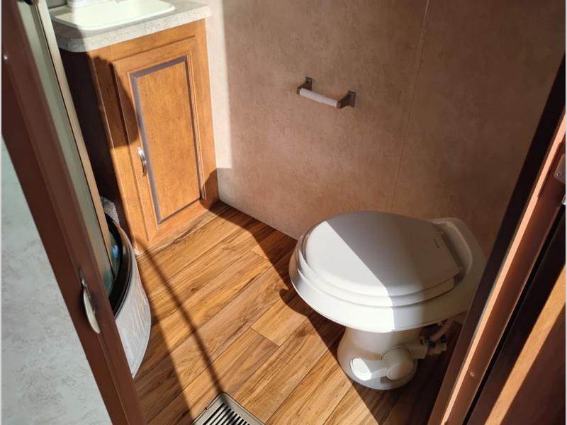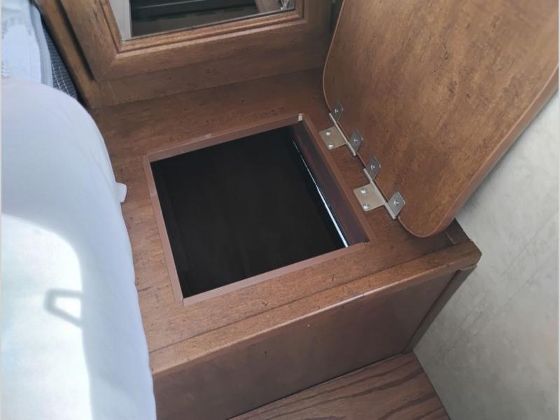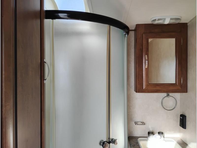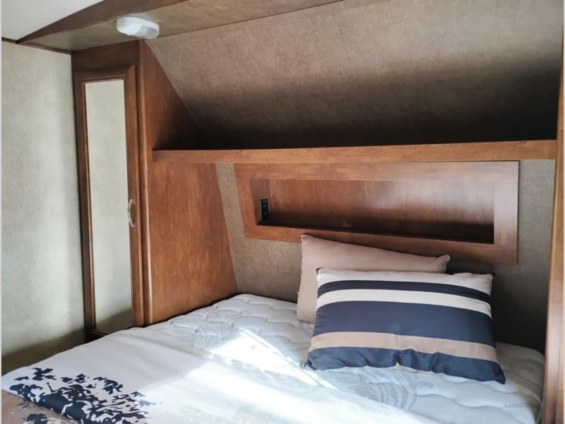 You will find overhead cabinets throughout the trailer as well as a large pass thru storage area.