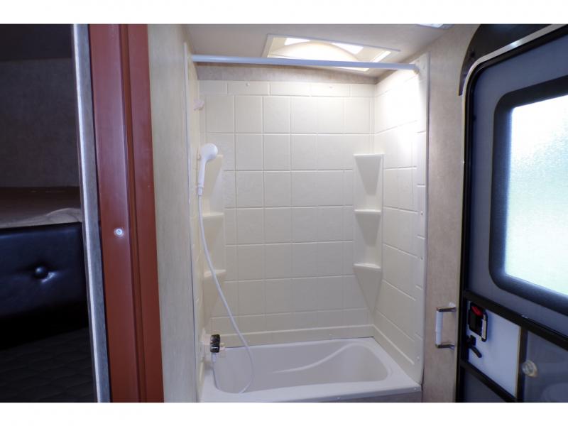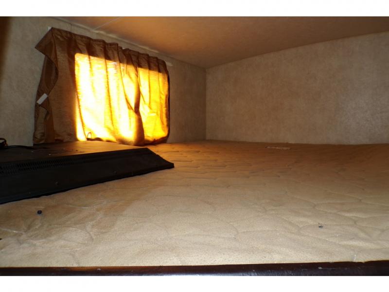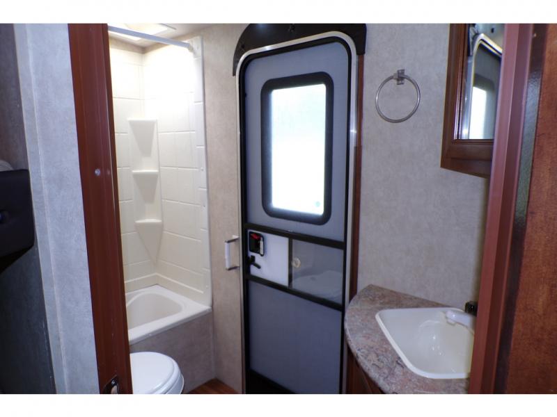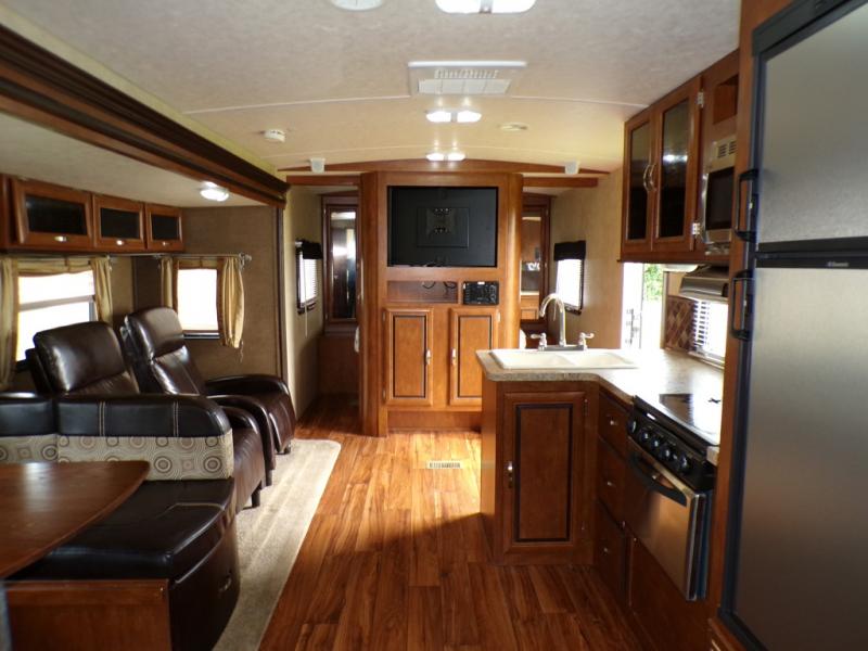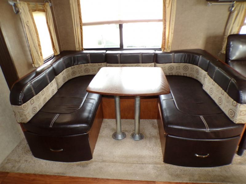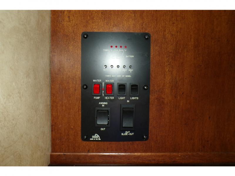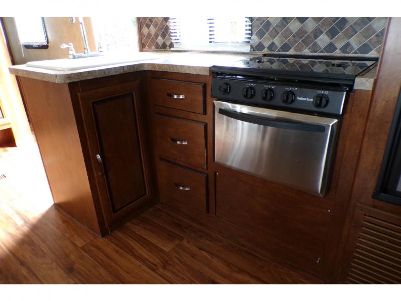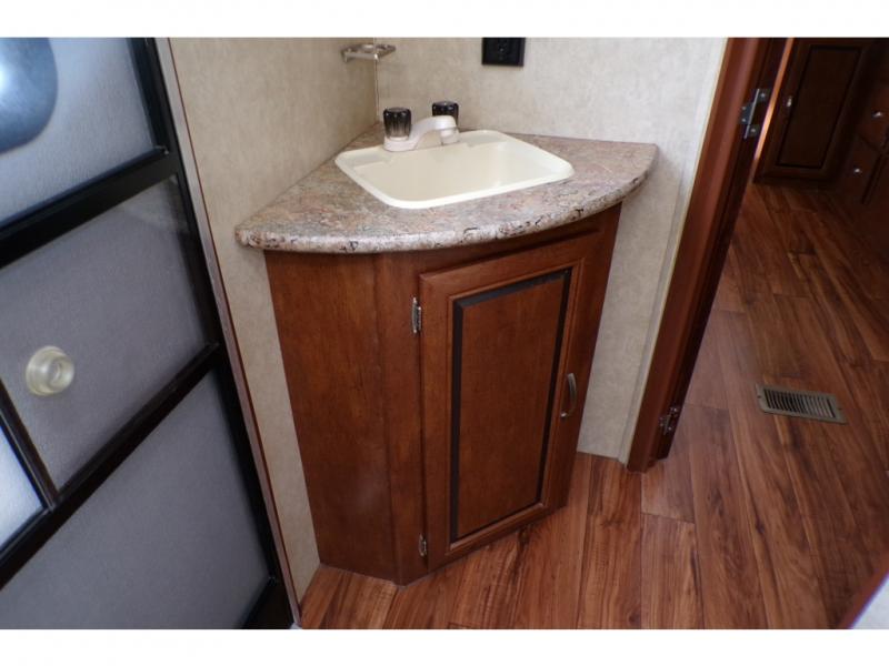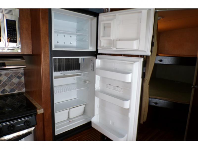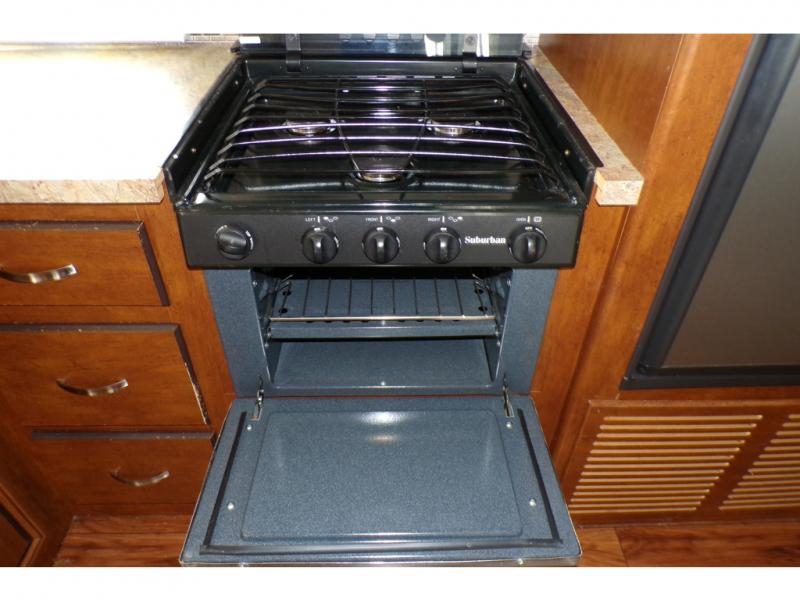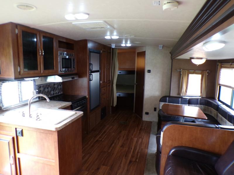 As you enter the travel trailer, to the left there is a double kitchen sink, three burner range, microwave, refrigerator, pantry, and wardrobe. On the opposite side of the trailer you will find a slide with a u-dinette and a jiffy sofa. Along the front of the living area you will enjoy the entertainment center.