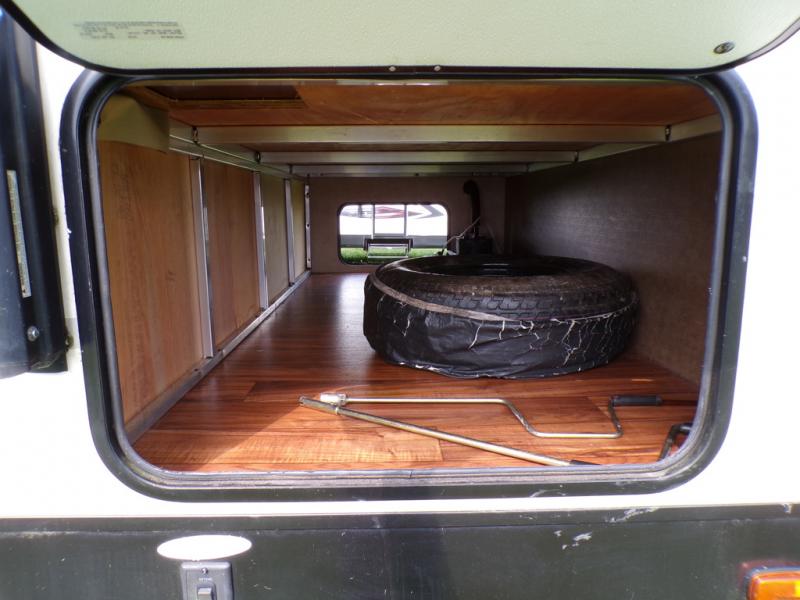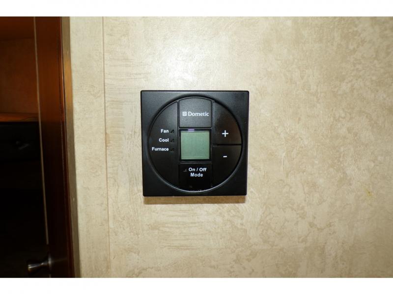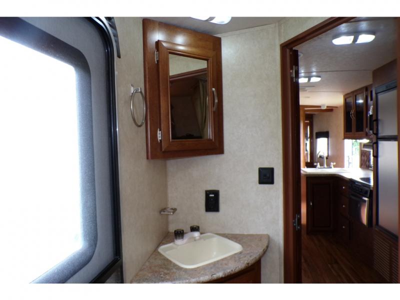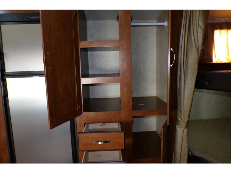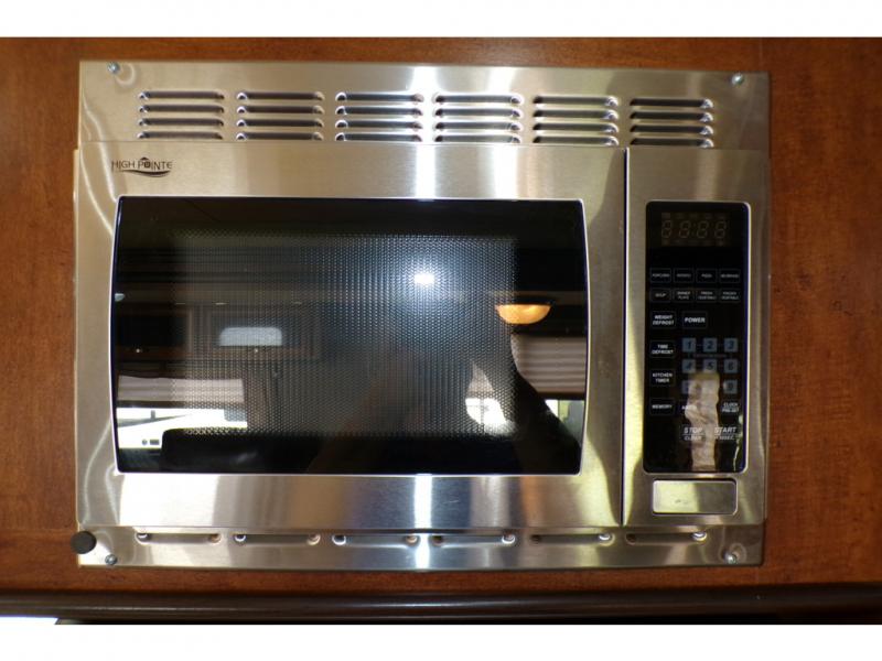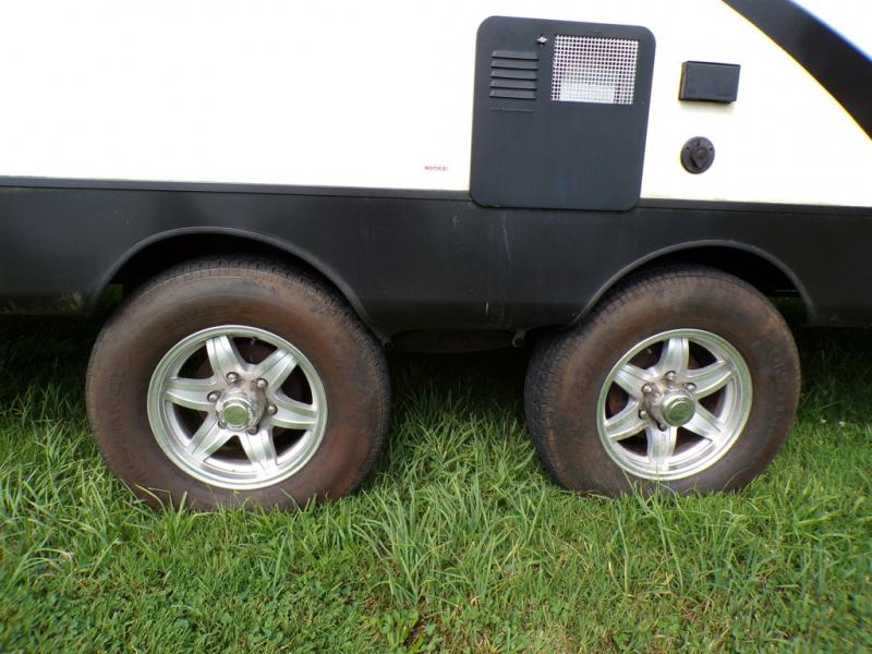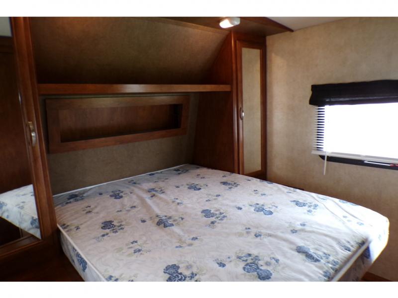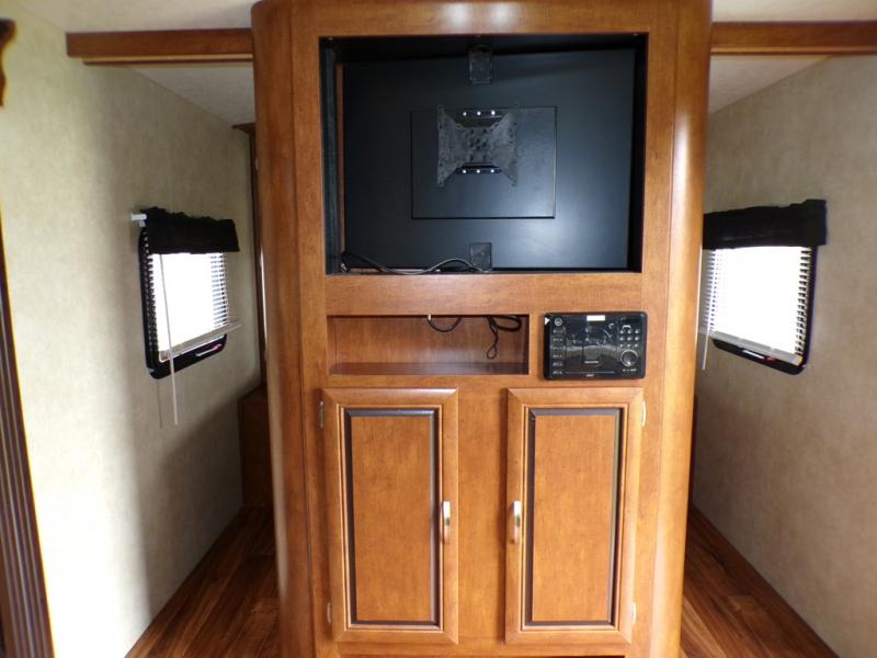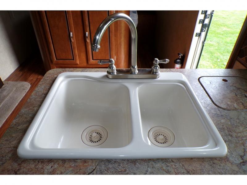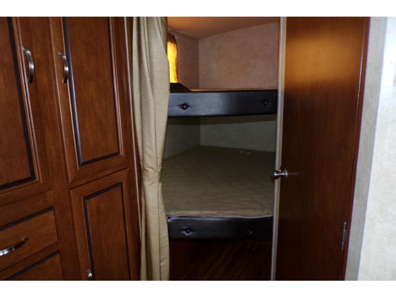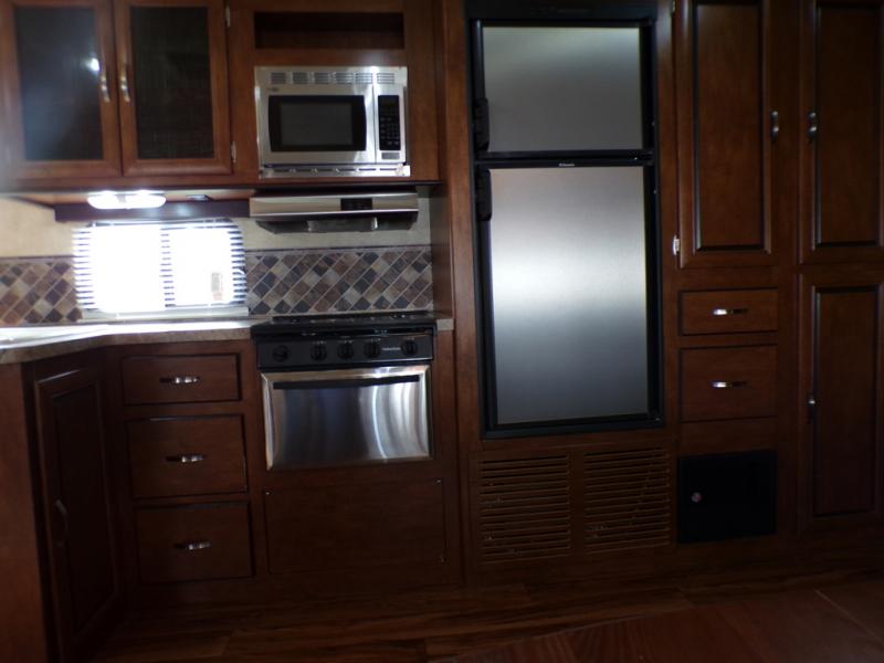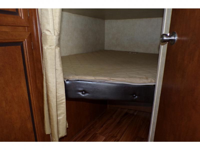 As you enter the travel trailer, to the left there is a double kitchen sink, three burner range, microwave, refrigerator, pantry, and wardrobe. On the opposite side of the trailer you will find a slide with a u-dinette and a jiffy sofa. Along the front of the living area you will enjoy the entertainment center.