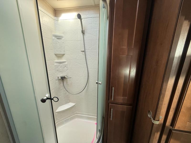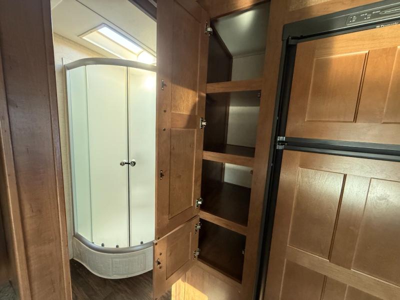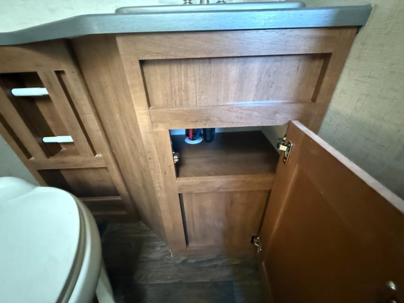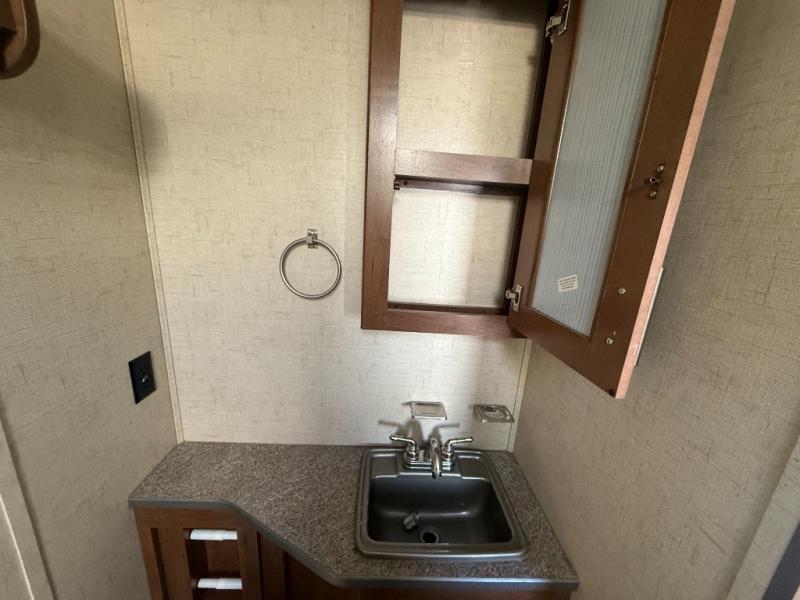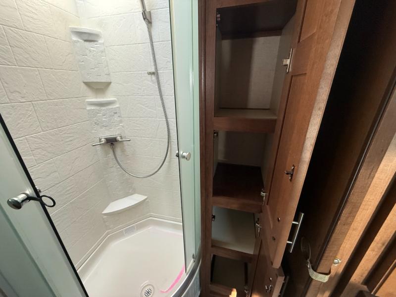 The bathroom is a walk-thru and offers a bit more space. On one side of the trailer there is a linen cabinet which can hold toiletries, and a corner shower. The other side of the bathroom has a toilet, sink, and medicine cabinet.