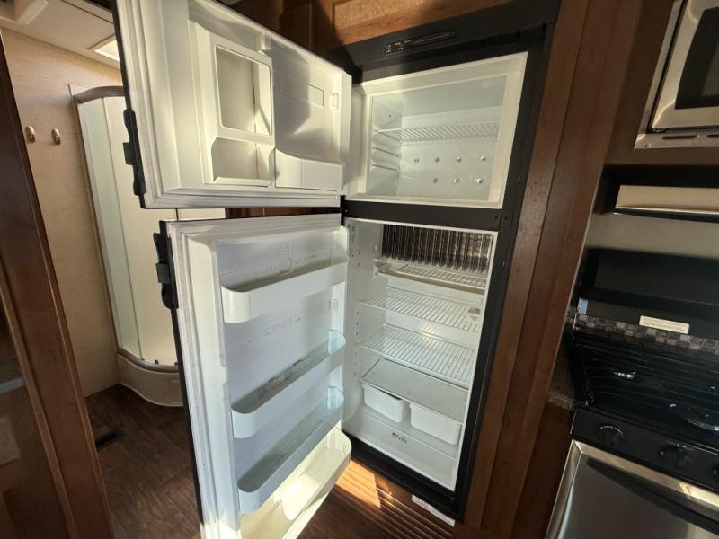 As you enter the rear entrance you will be in the living/kitchen area. Along the rear wall there are two lounge chairs and an end table. The slide has a sofa and a dinette or you can choose an optional free-standing table and chairs. Adjacent to the slide you will find an entertainment center. Across from the slide there is a bit more counter space with the flip-up counter as well you will find the following, a double kitchen sink, three burner range, microwave, refrigerator, and large pantry.
