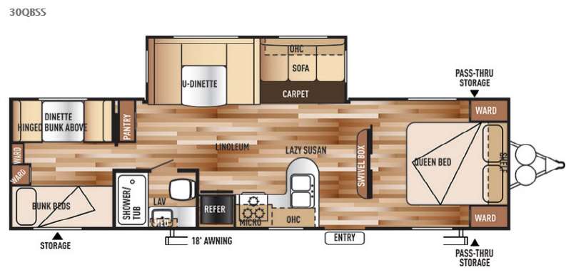 There is plenty of storage with the exterior pass-thru storage and all of the interior overhead cabinets.