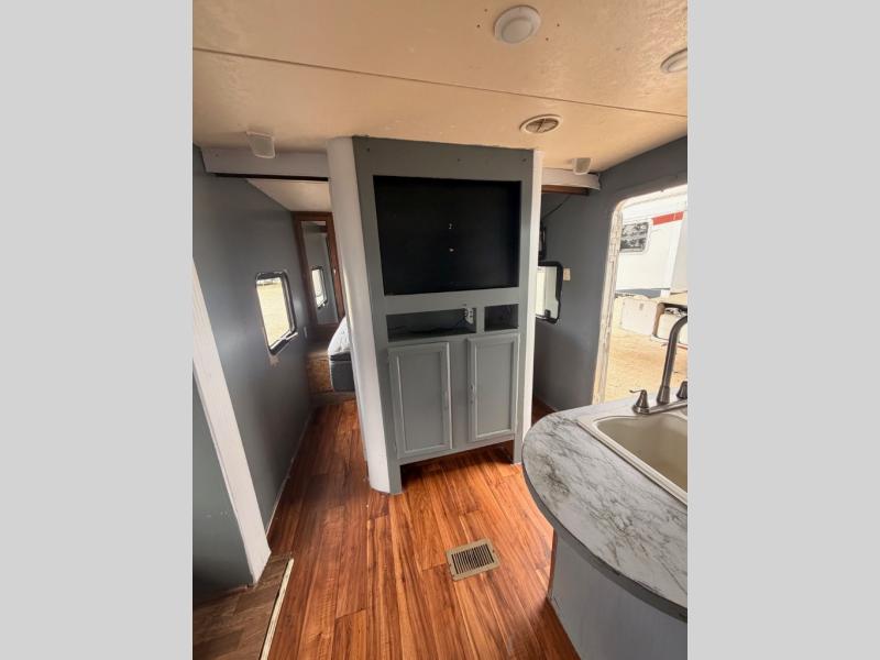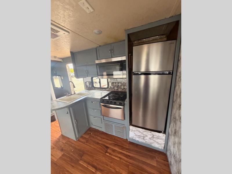 The main living area offers a slide with a sofa and a u-dinette. Next to the slide you will find a nice size pantry. On the opposite side of the trailer you will find a double kitchen sink, three burner range, microwave, and refrigerator. Along the front of the living/kitchen area there is a swivel box for your enjoyment.