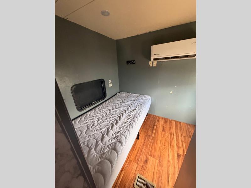 The rear bunk house has a dinette with a hinged bunk above. On the opposite side there is an upper bunk. Along the rear wall you will find two wardrobes.
