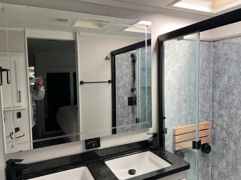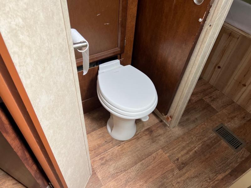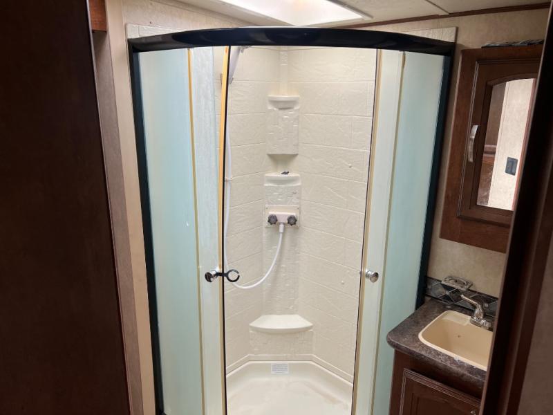 The bathroom is a walk-thru with a toilet and linen cabinet on one side of the trailer. On the other side there is a sink, medicine cabinet, and radius shower.